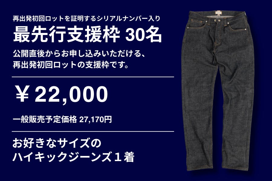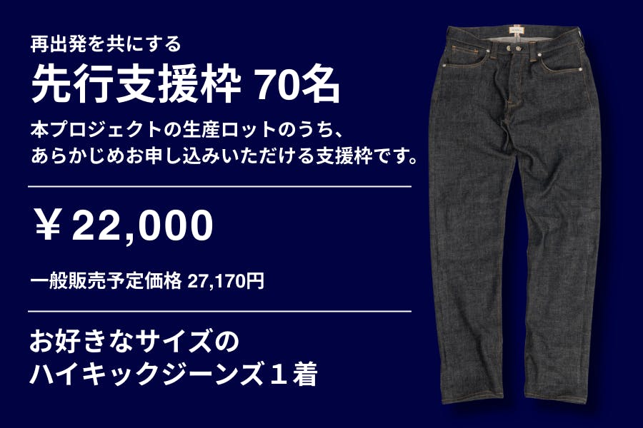 この300万円で約束できるのは、「利益を最大化すること」ではなく、「支援してくださった分のハイキックジーンズを、最後まで作りきり、届け切ること」です。