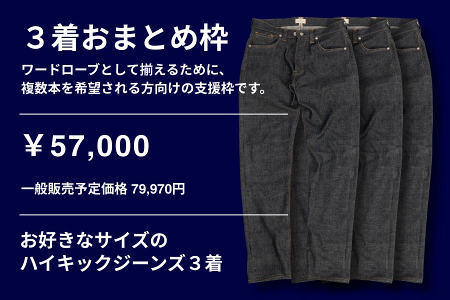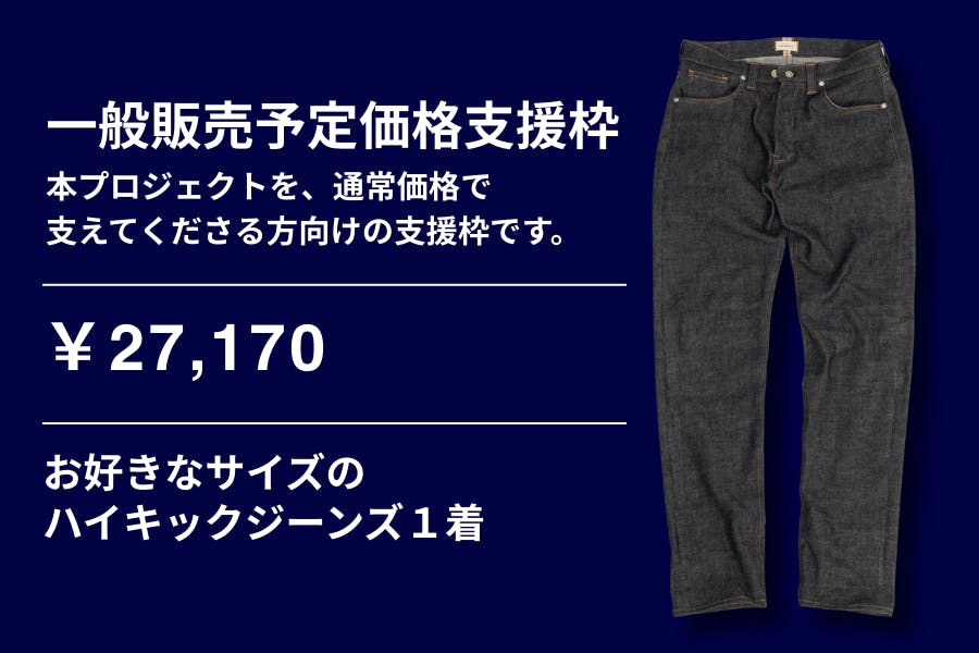 今回のプロジェクトでは、ハイキックジーンズを支援の形に応じて選べるリターンをご用意しました。価格や数量の設定は、「できるだけ多く集める」ためのものではありません。現在の体制で、確実に作りきれる数量を前提に設計しています。