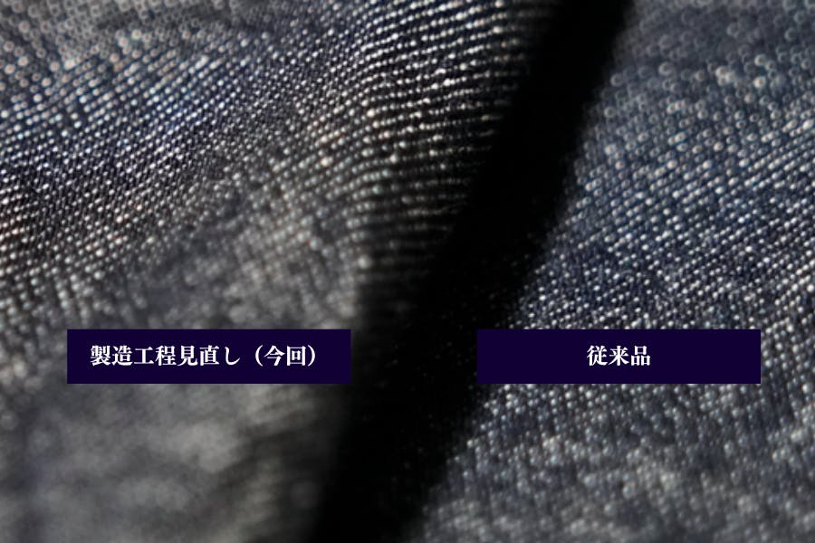 また、今回の製造工程の見直しによって、ジーンズ表面のインディゴの色が今よりも濃色になるため、ジャケットなどとのきれいめなコーディネートにおいて、より清潔な印象を与えることができます。