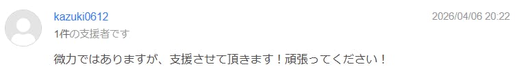 --- ご支援ありがとうございます!「微力」だなんてとんでもありません。kazuki0612様からいただいたそのお気持ちが、100%達成という大きなゴールに向かうための、何よりの追い風です。ALL YOURSの再出発を信じてくださり、本当にありがとうございます。 皆さまの期待に応えられるよう、最後の一歩まで全力で頑張ります!お届けを楽しみにお待ちください。これからもALL YOURSをよろしくお願いいたします!