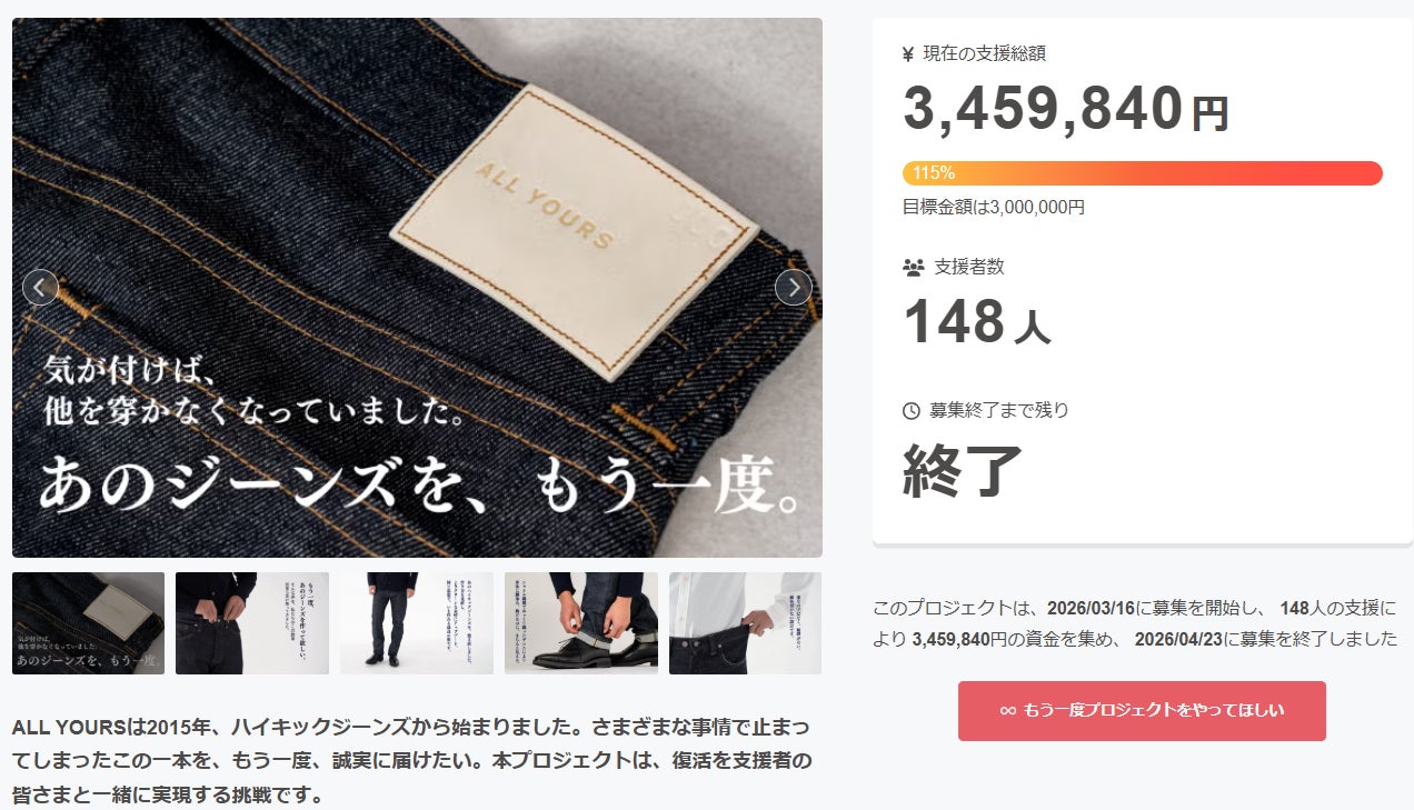 2026年4月23日 23時59分。 ハイキックジーンズ復活プロジェクトは、148名の方から目標金額を上回る3,459,840円のご支援をいただき、無事に終了いたしました。