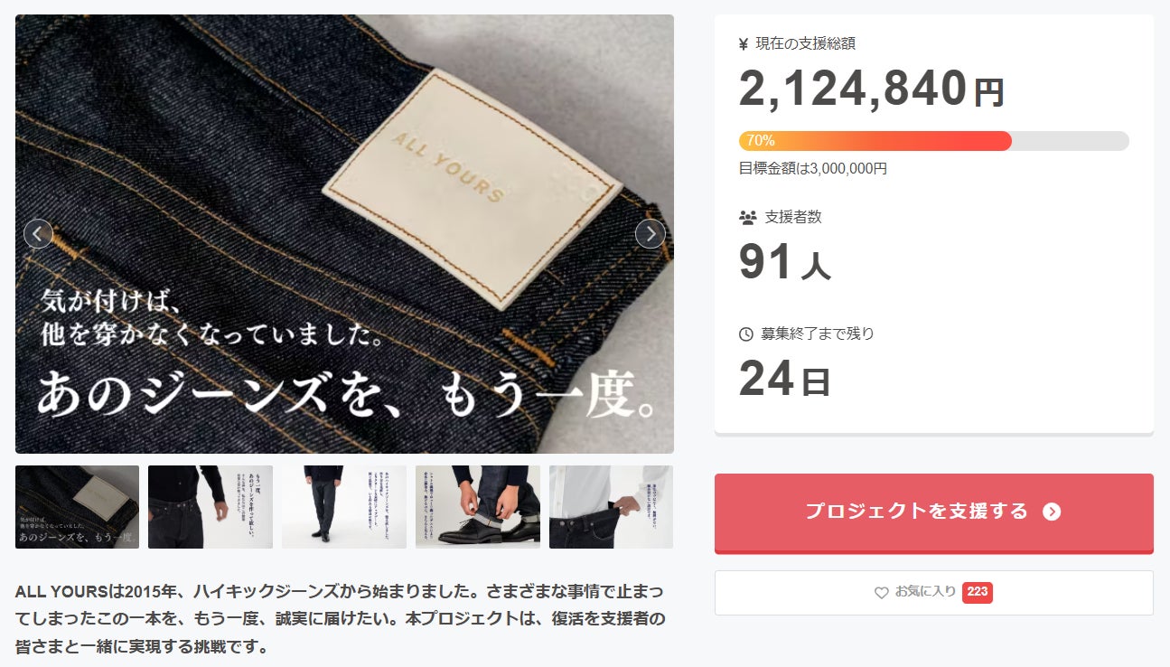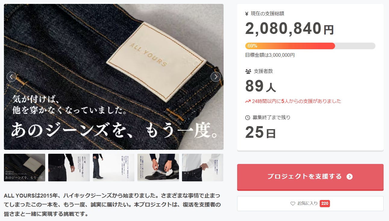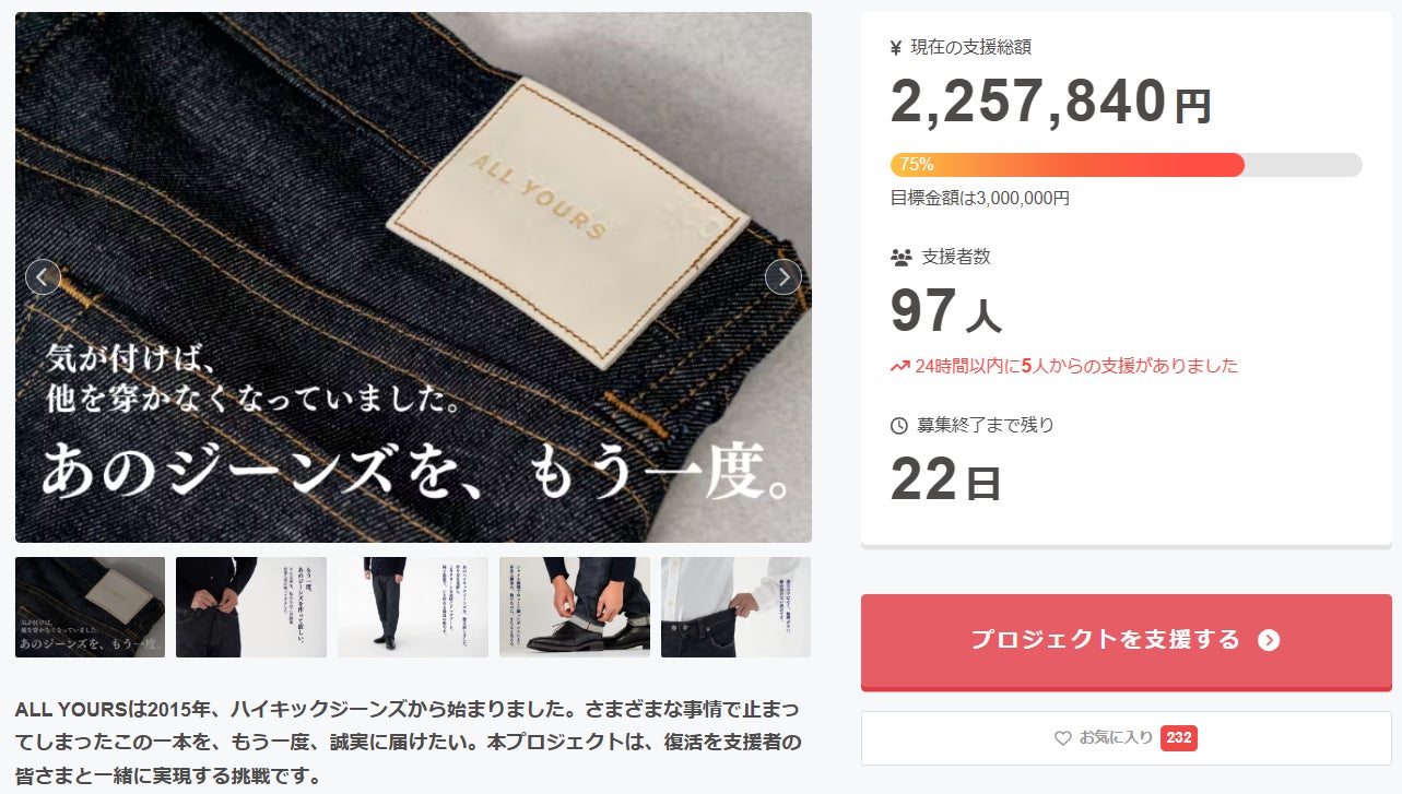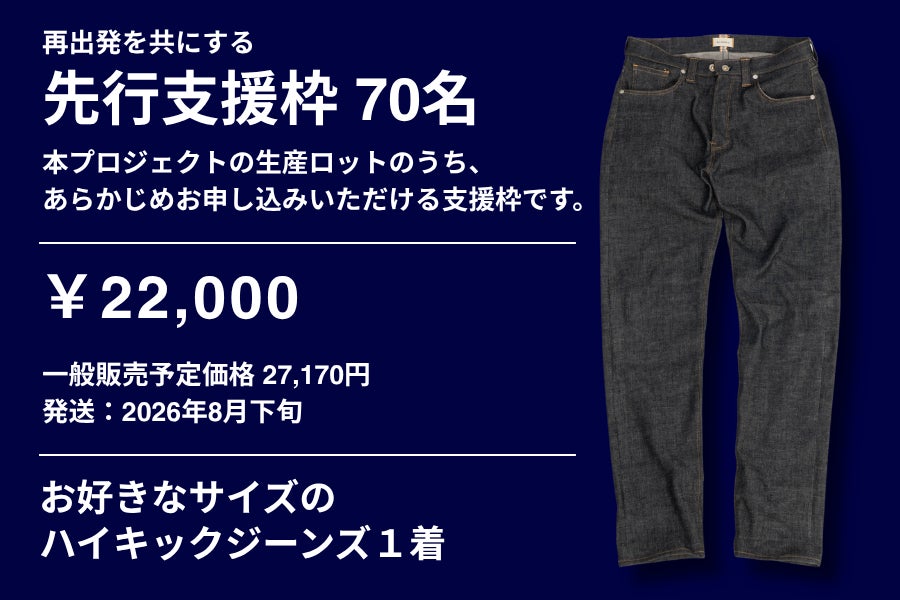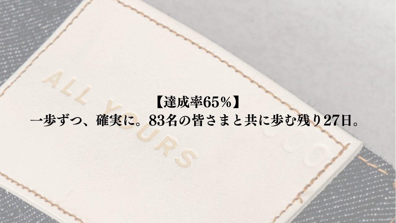 皆さま、こんにちは。ALL YOURSです。また一つ、大きな階段を上ることができました。 本日、支援総額が2,257,840円に達し、達成率75% を突破いたしました!現在、97名 もの方々に支えていただいています。 いよいよ100名の大台、そして目標達成まで「あと4分の1」という場所まで来ることができました。この数日間、特に心強かったのは、10年以上前のモデルを今も愛用してくださっている方からのメッセージや、日々途切れることなく届く温かなご支援です。 立ち止まっていたALL YOURSが、こうして再び走り続けられるのは、紛れもなく皆さまが伴走してくださっているおかげです。本日も、新たに届いた大切なメッセージをご紹介させてください。- 池尻の店舗で、初めて足を通した時の感覚を覚えていてくださり、本当にありがとうございます!あの場所で皆さまと対話し、直接製品の良さを伝えていた日々は、ALL YOURSのモノづくりの原点です。「ずっとファンです」と言っていただけること、そしてこの復活を喜んでいただけること、心から感謝の気持ちでいっぱいです。池尻で出会ったあの頃の情熱はそのままに、今のALL YOURSができる最高の誠実さを持って、進化したハイキックジーンズをお届けします。楽しみにお待ちください!- ALL YOURS品質を信じ、この再出発のタイミングで「初めてのハイキックジーンズ」を選んでくださり、本当にありがとうございます!「この機会に応援したい」というお言葉、ALL YOURSの再始動に大きな意味を持たせていただきました。 atarigawa様の期待を裏切らないよう、そして「手に入れてよかった」と心から思っていただけるよう、一着一着、誠実にお作りしてお届けします。これからも良いものを作り続ける。その約束を、製品を通じて証明してまいります。【先行支援枠に関するお知らせ】ご検討中の方へ、大切なお知らせです。 再出発のパートナーとして一番お届けしやすい価格でご用意した「先行支援枠(22,000円)」が、いよいよ残り19名様となりました。この枠が終了しますと、次の支援枠へと移行いたします。 もしサイズやタイミングで迷われている方がいらっしゃいましたら、ぜひこの機会に、一番納得のいく形で仲間に加わっていただければ幸いです。プロジェクト終了まで、残り22日。 長いようで短いこの挑戦も、ここからが本当の正念場です。「毎日誰かが支援してくれている」 この喜びを噛み締めながら、製品を最高のものに仕上げる準備を加速させています。100%の達成、そしてその先にある皆さまの笑顔。 その瞬間を共に迎えるために、ALL YOURSは一歩も緩めることなく、誠実に、真っ直ぐに走り抜けます。引き続き、ALL YOURSへの温かい応援をよろしくお願いいたします!