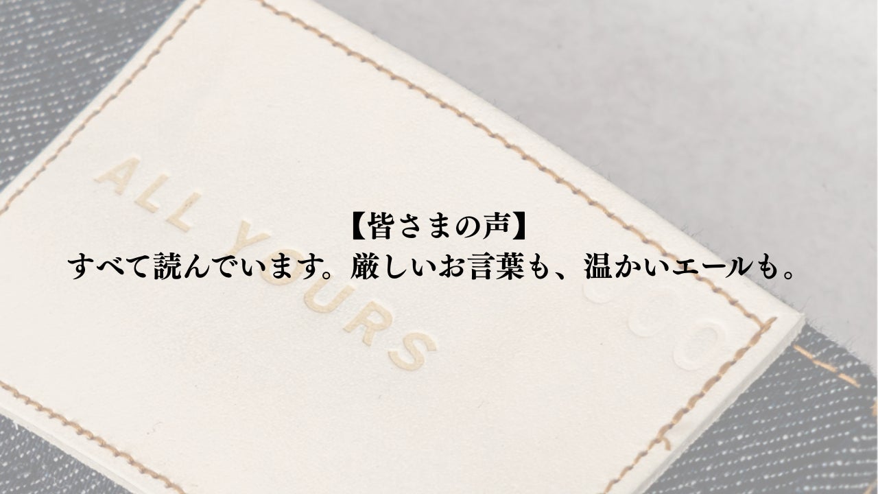 皆さま、こんにちは。ALL YOURSです。プロジェクト公開から5日、目標の50%を突破し、驚くほどたくさんのメッセージをいただいています。その多くが「応援しています」「頑張ってください」という、あたたかくも力強いお言葉です。画面越しにその文字が並ぶのを見るたび、私たちは一人ひとりの支援者様の顔を思い浮かべ、深く、深く感謝しております。すべて大切に読ませていただいています。その中から、今回は特に具体的な想いを寄せてくださった3名の方へ、この場を借りてお返事をさせてください。ーーー 商品だけでなく「組織の復活」を願ってくださるお言葉、とても身が引き締まります。負債を抱えた状態からの再出発ですが、一着一着を確実にお届けし、誠実な運営を積み重ねることで、本当の意味での「復活」を果たします。ーーー 長く、深く、ALL YOURSのプロダクトを生活のパートナーに選んでくださり、本当にありがとうございます。その「また」という言葉に込められた期待を、重く、大切に受け止めています。2026年版は、これまでの3本を超えて「やっぱりこれが一番だ」と思っていただけるクオリティに仕上げますので、お届けまで、ぜひ楽しみにお待ちください。ーーー かつて販売終了で後悔させてしまったとのこと、その節は申し訳ございませんでした。それから時を経て、ALL YOURSのを今知り、こうして再出発を応援してくださったことに深い縁を感じます。 キックボクシングのジムでもぜひ!その名の通り「ハイキック」が打てるほどの自由さをお届けします。ジムの仲間にも驚かれるような穿き心地を、どうぞお楽しみにお待ちください。最後に厳しいお言葉も、シンプルな励ましも、すべてが今の私たちの原動力です。 現在、達成率は50%を超えました。達成まで、あとおよそ60名様からのご支援が必要です。引き続き、ALL YOURSの覚悟を見守っていただければ幸いです。