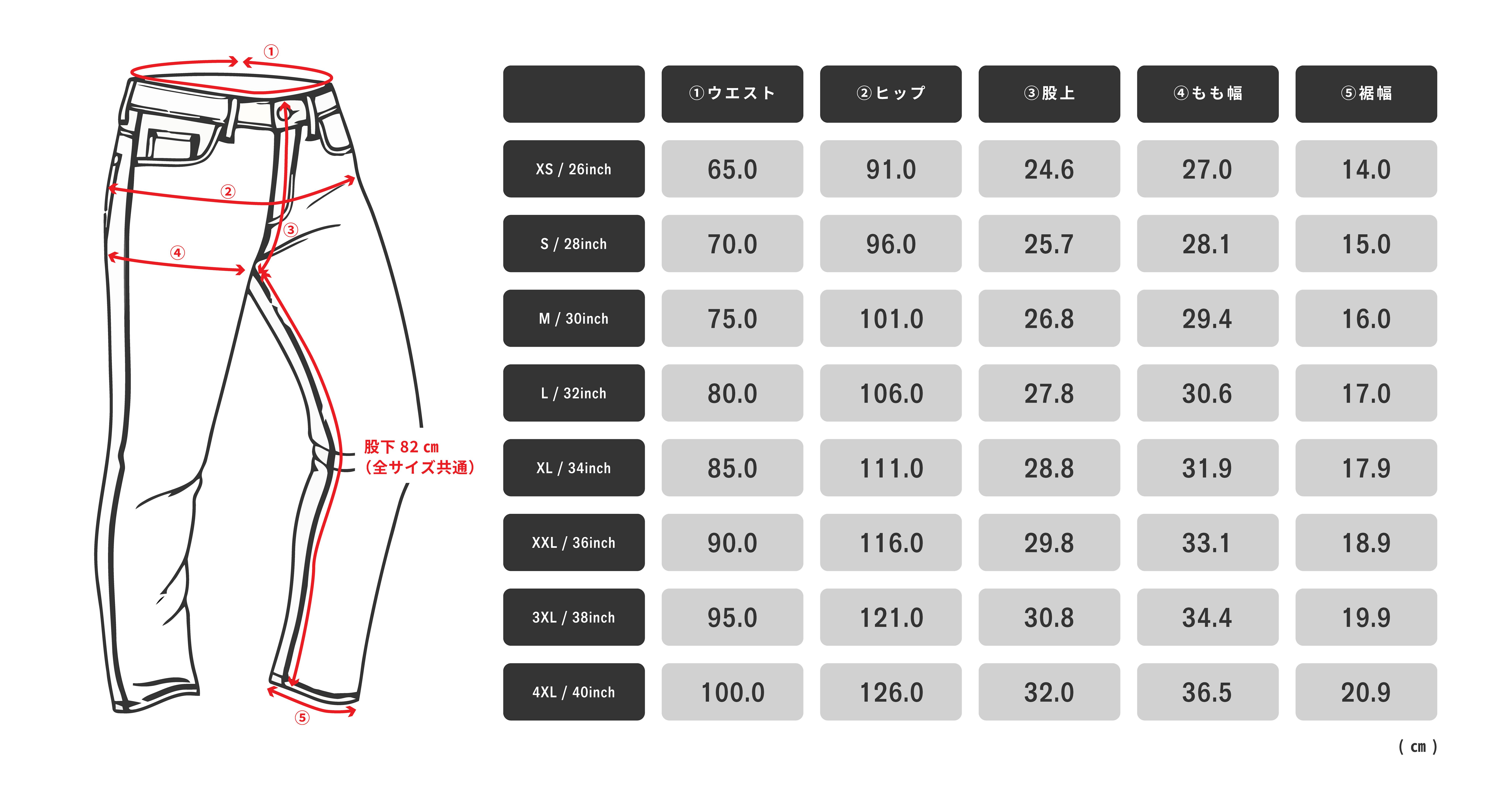 詳細なサイズ表(ウエスト/ヒップ/股上/裾幅など)を記載していますので、お手持ちのジーンズと比較しながらお選びください。