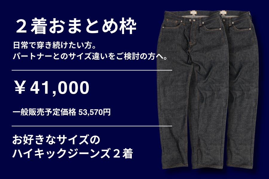 今回のプロジェクトでは、ハイキックジーンズを支援の形に応じて選べるリターンをご用意しました。価格や数量の設定は、「できるだけ多く集める」ためのものではありません。現在の体制で、確実に作りきれる数量を前提に設計しています。