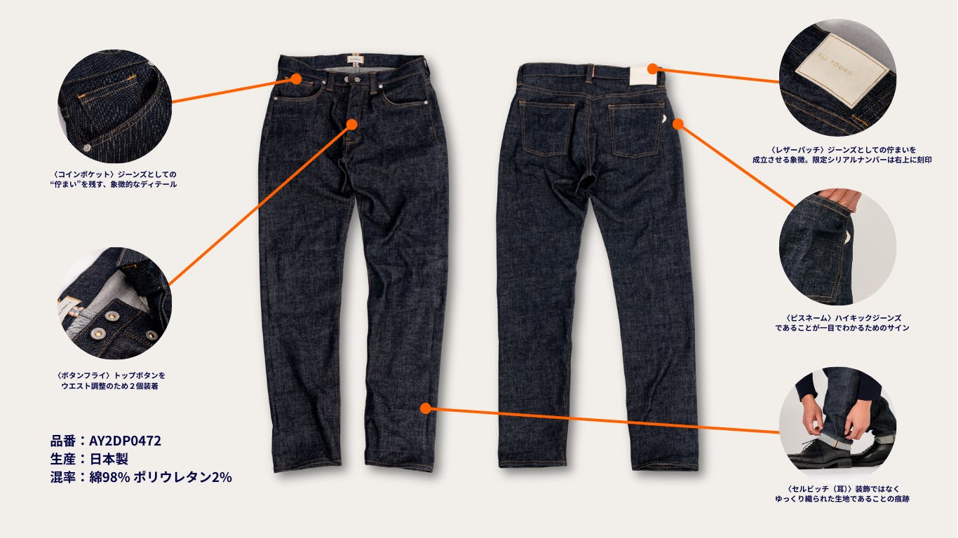 シャトル織機のセルビッチデニム、ボタンフライ、動きに追従する設計。もしこの一本を覚えていてくれる方が150人いれば、再び生産します。