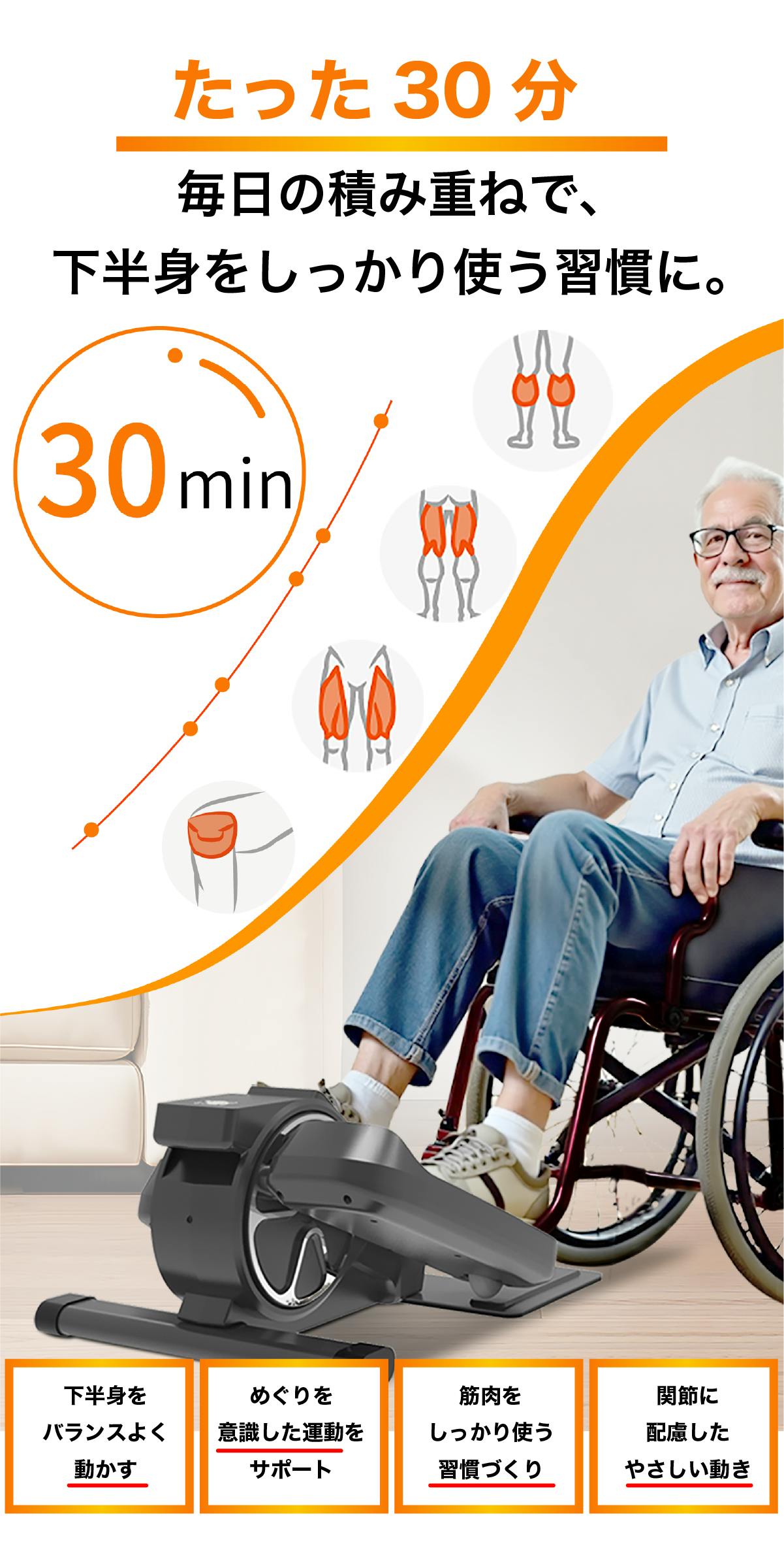 A. 座ったまま使える設計のため、幅広い年代の方に取り入れやすい仕様です。ご使用の際は、必ず無理のない範囲で行ってください。