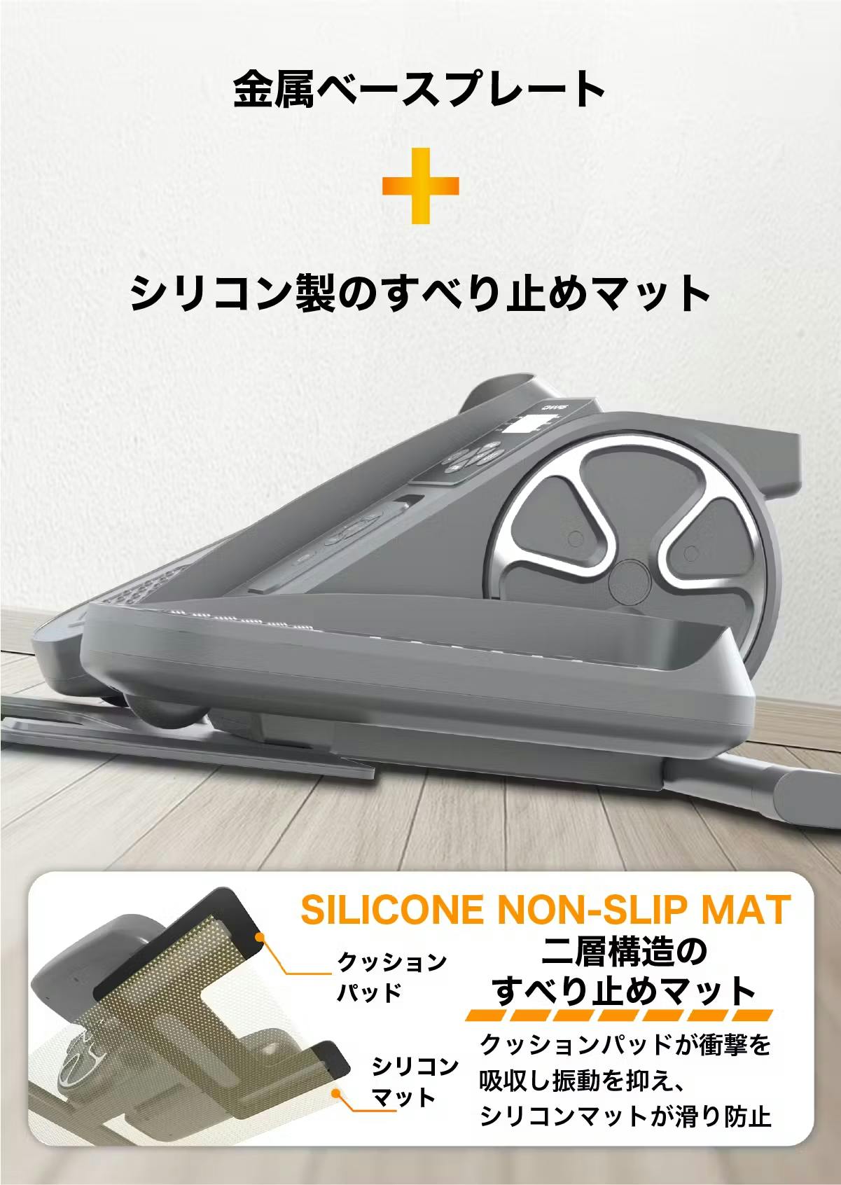 さらに、電動ステッパーには、二重構造の滑り止めマットが採用されています。まず、クッションパッドが衝撃を吸収し、運動中に発生する振動を抑える役割を果たします。これにより、足腰や膝への負担が軽減され、快適な運動が可能になります。次に、シリコンマットが滑りを防ぎ、さらにしっかりとした足元を提供します。この二重構造により、安定性が大幅に向上し、長時間の使用でも安心して運動を続けることができます。