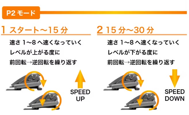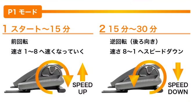 P1モードは、正回転15分・逆回転15分のゆったりとしたリズムで構成されています。動きは比較的穏やかで、脚や膝への負担を抑えながら下半身をじんわりと動かすことができます。特に運動に慣れていない方や、体力に不安がある方、リハビリ目的で軽い運動を取り入れたい方に適しています。正回転と逆回転をバランスよく行うことで、太ももやふくらはぎなど複数の筋肉を自然に使うことができ、血行促進や筋肉の柔軟性向上にもつながります。激しい動きではないため、テレビを見ながらや読書をしながらでも取り組めるのも魅力です。日々の生活に無理なく溶け込む、やさしい運動モードといえるでしょう。