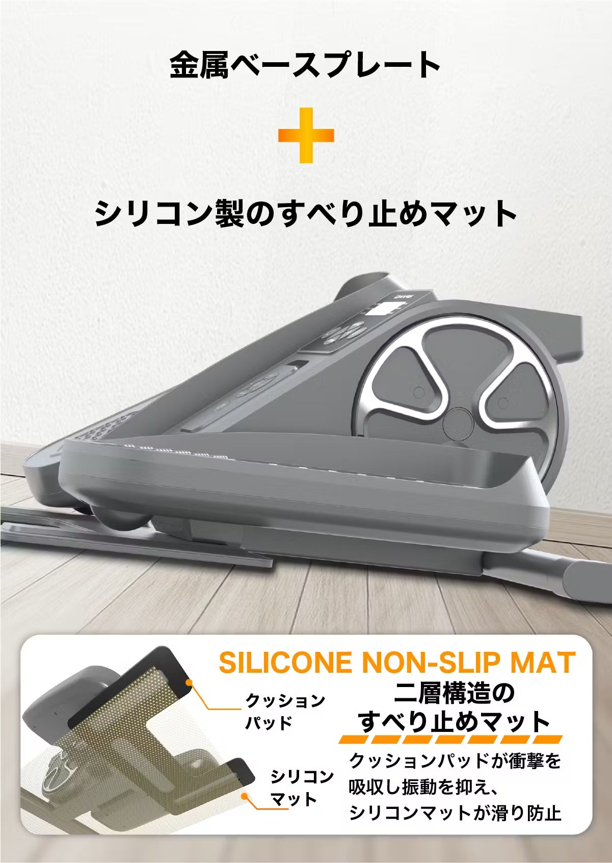 本体底面には、シリコン製のすべり止めマットを採用。振動や摩耗に配慮した設計で、使用中のズレを軽減します。高弾性素材が床面にしっかりフィットし、フローリングやタイルの上でも安定感を保ちます。運動中に本体が動いてしまう不安が少ないため、安心して脚を動かすことが可能です。また、床へのダメージを抑える効果も期待できるため、室内での使用にも適しています。