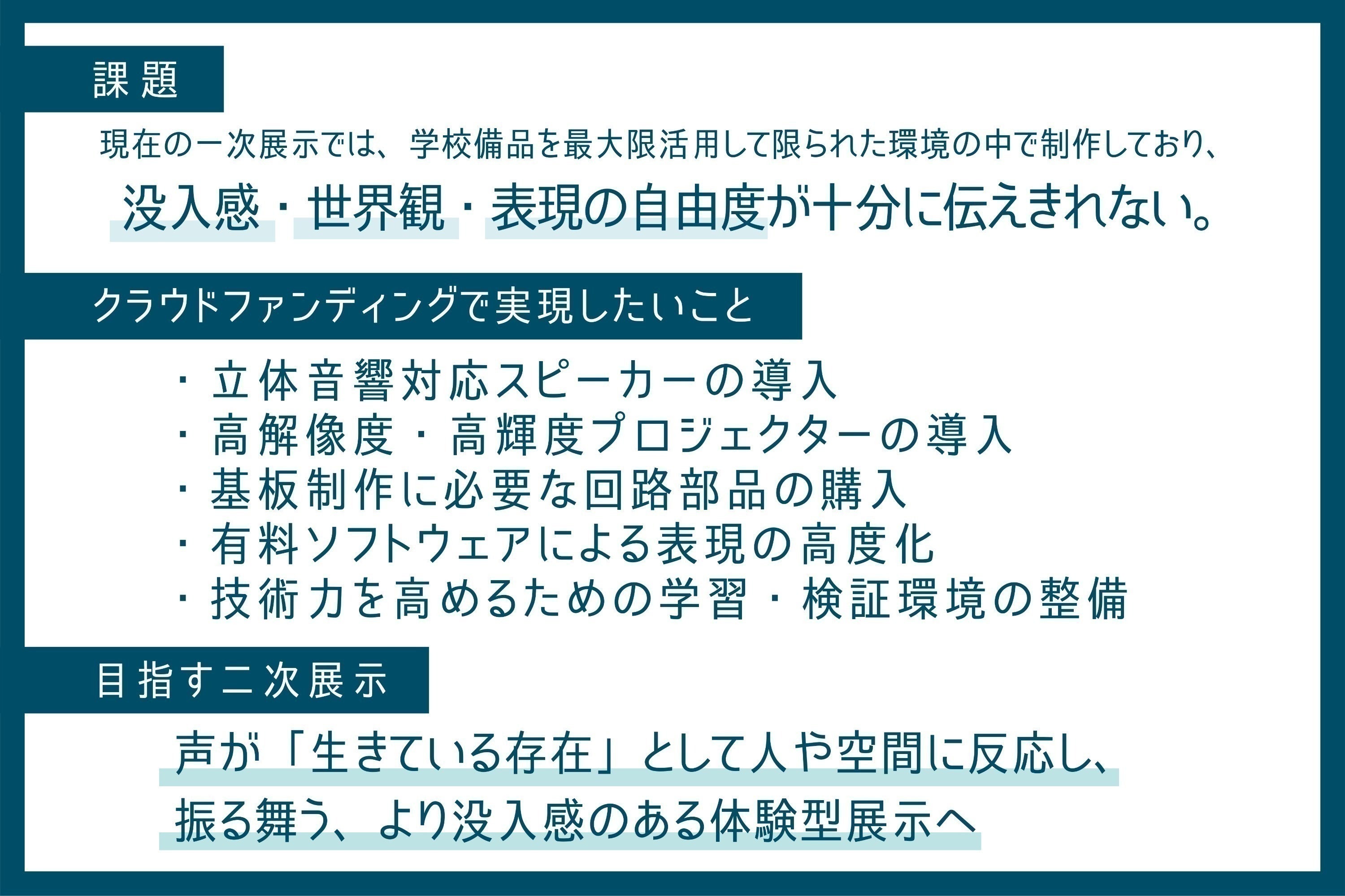 などを導入することで、二次展示では、声が空間や人に反応しながら振る舞う、より没入感のある体験を実現できると考えています。皆さまからのご支援は、作品を完成させるためだけでなく、この表現を次の段階へ進めるための大きな力になります。