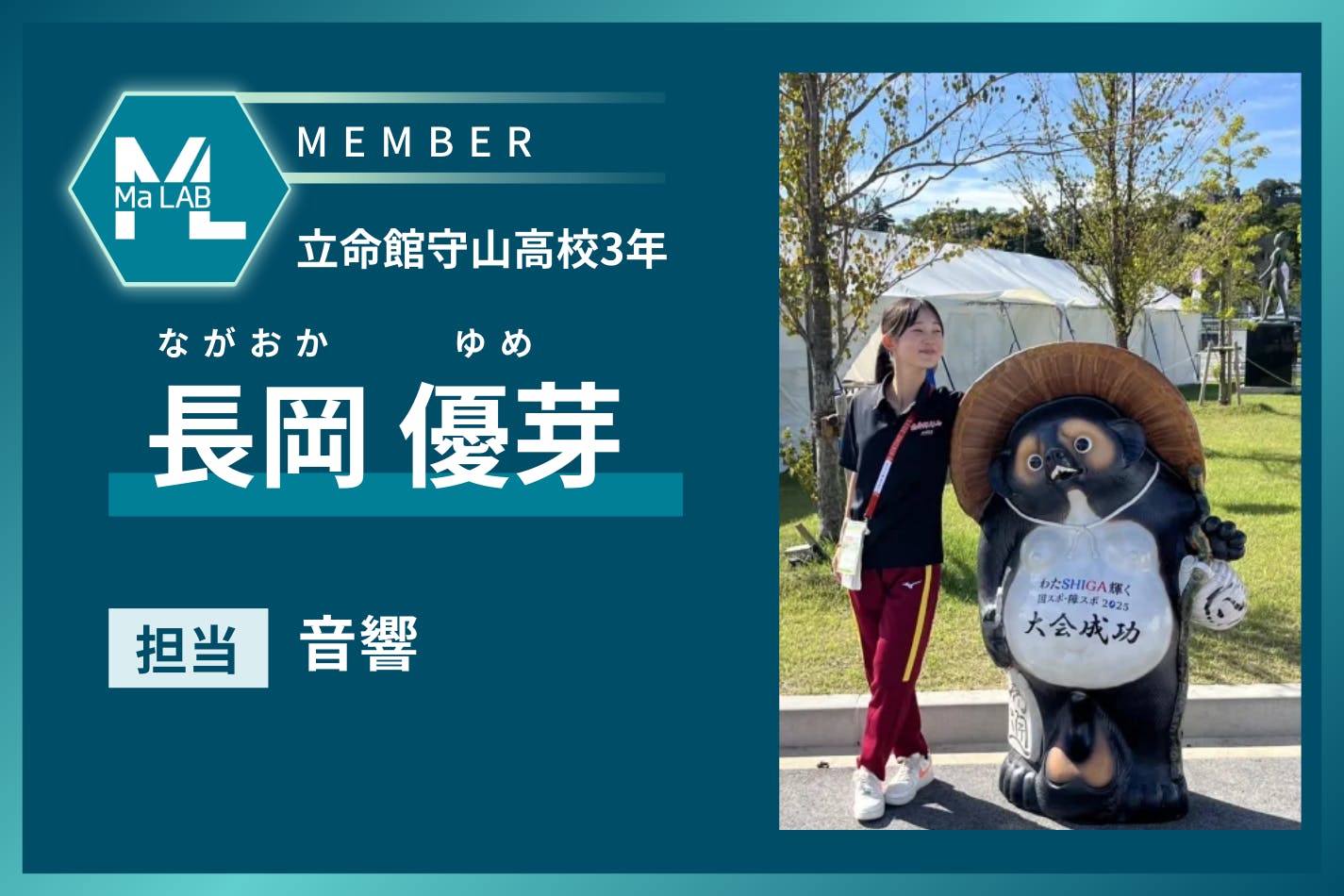 今回挑戦している7名の皆さんとは、立命館守山高校で先駆的に実施をしている生徒会DXやAIを活用した英語教育の取り組みを通じて関わってきましたが、日頃から社会への鋭い問題意識を持ち、自分たちの言葉で表現しようとする姿に刺激を受けています。「声の行方」という新しい表現方法で、光と音を使い想いを伝えようとする挑戦は、これからの時代を象徴する試みです。その姿は、きっと後輩たちの道しるべとなります。最後まで挑戦し続けてください。心から応援しています。