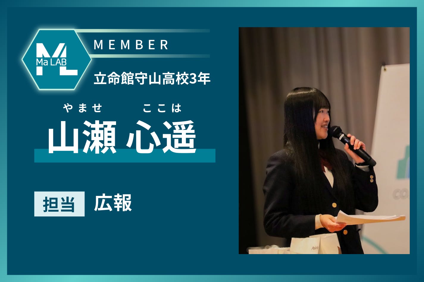 ポスターやデジタルサイネージなど、目に見えるデザインを通して伝えることが好きです!ただ情報を届けるだけでなく、見た人の足が止まったり、気持ちが少し動いたりする瞬間に魅力を感じています。Ma LABのメディアアート制作を多くの方に知ってもらい、見てみたい・体験してみたいと思ってもらえるよう、広報という立場からプロジェクトを支えていきます!