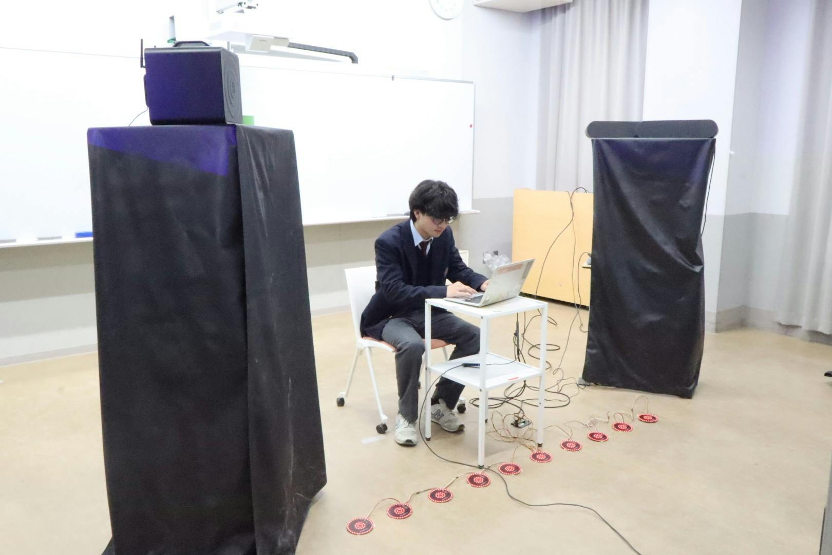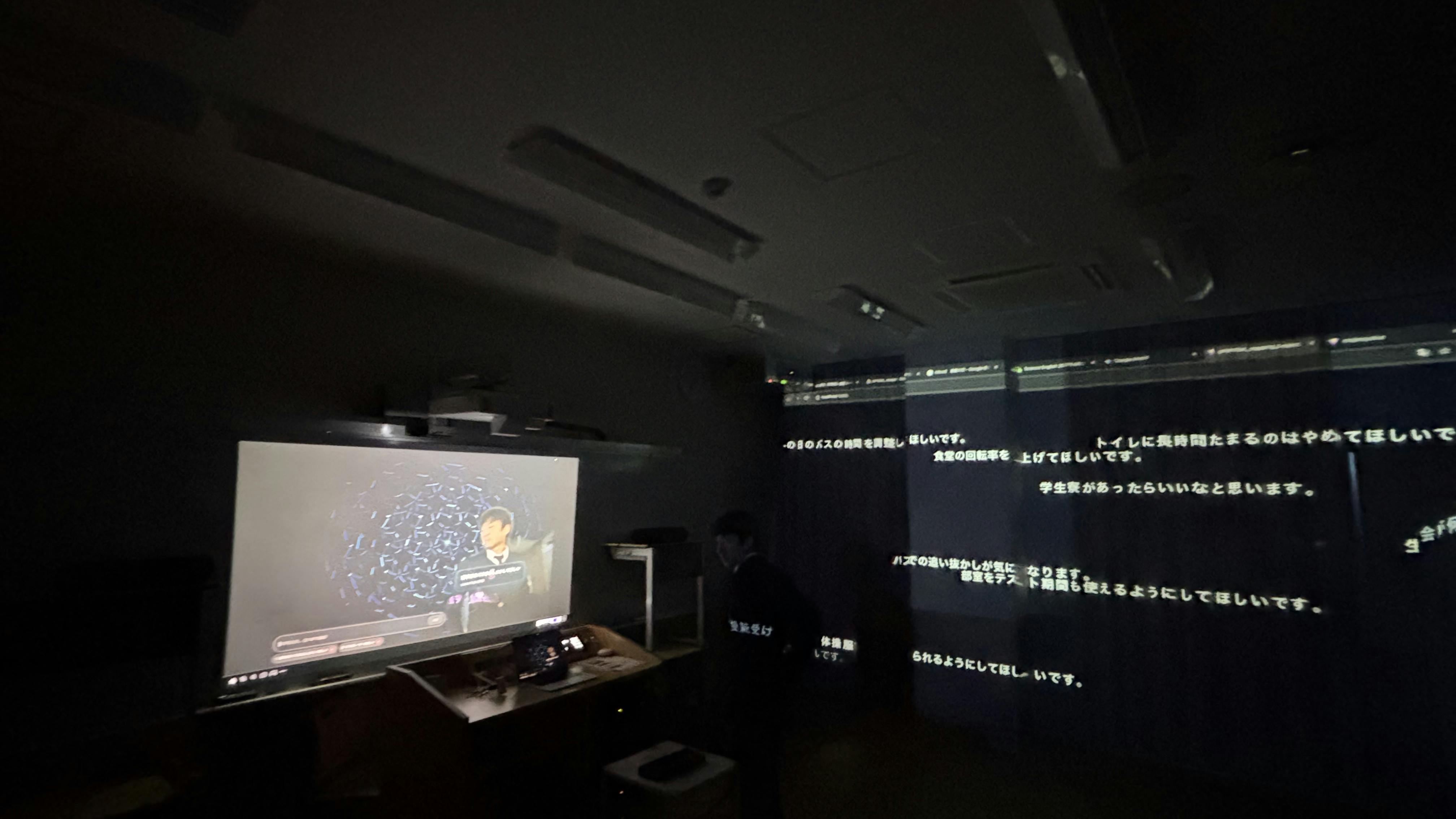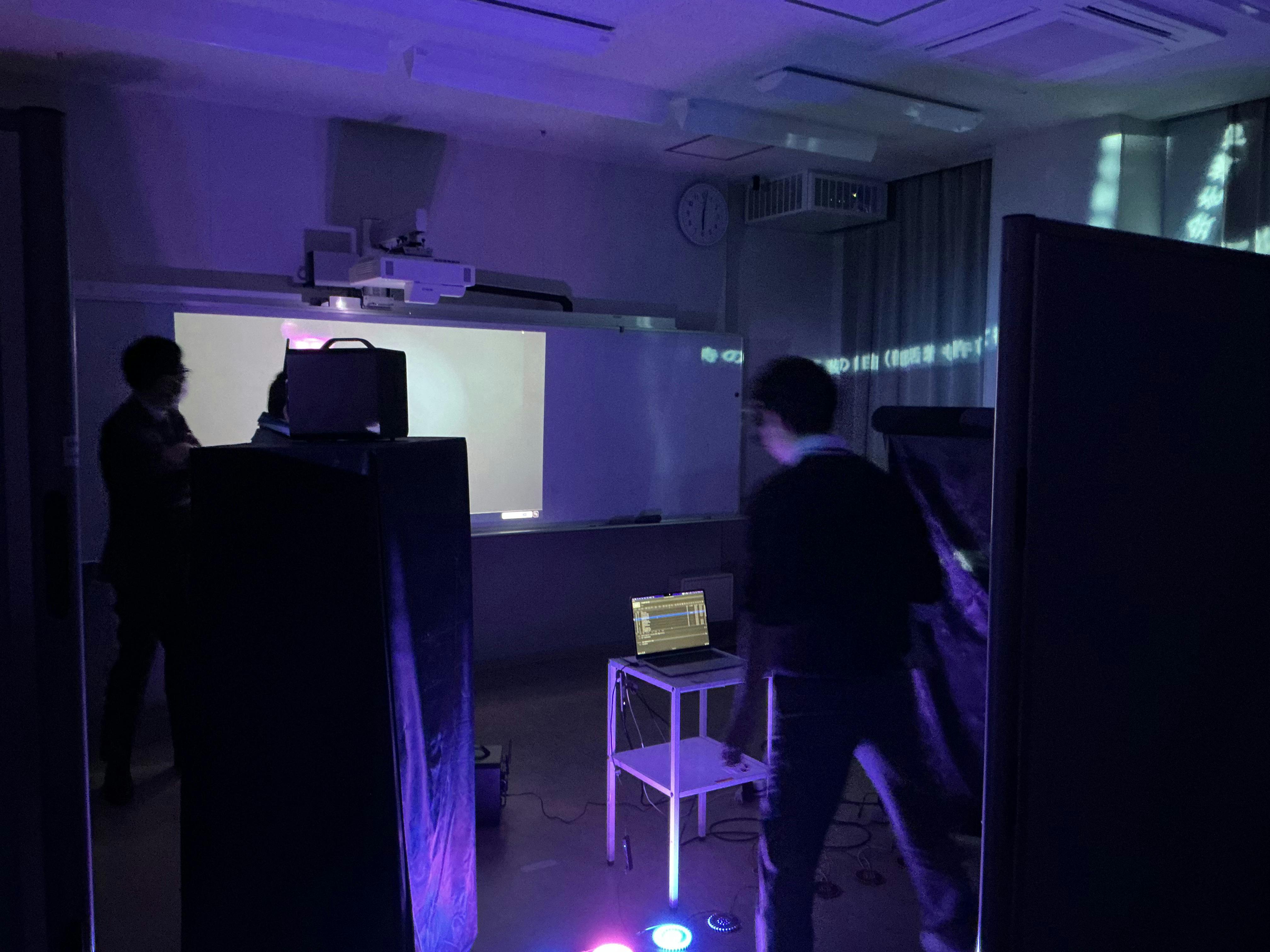 現在の一次展示は、学校備品を最大限活用し、限られた環境の中で制作しています。立体音響用ではない複数種のスピーカーをプログラムで制御し、性能の低いプロジェクターもソフトウェア補正によって成立させてきました。現状は「技術力によって性能の限界を引き上げた展示」です。