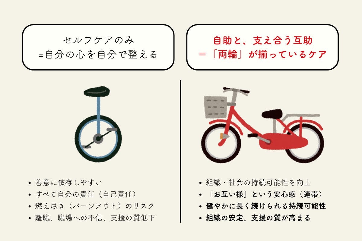 だからこそ、支援者へのセルフケアだけではなく「支え合い」の両輪が揃った社会、対人支援職をみんなで支える社会をつくりたい。