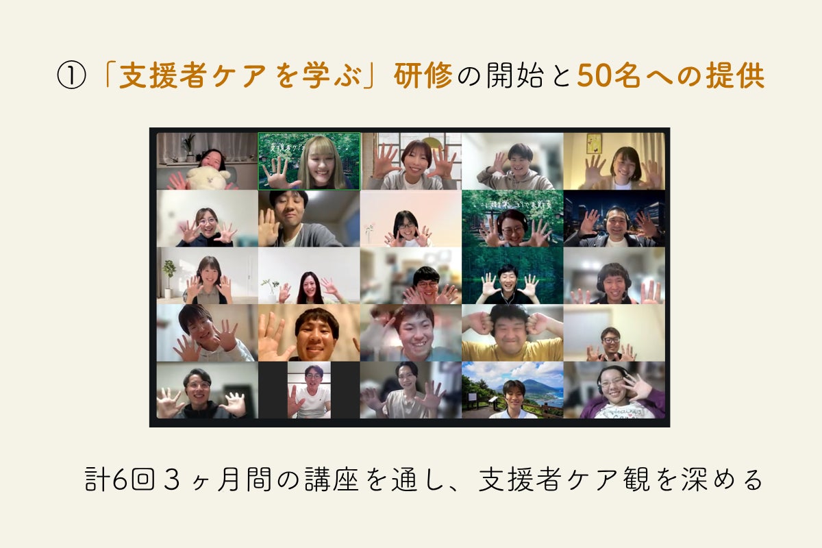・「支援者ケアを学ぶ研修」50名への実施費用:100万円(講座開発費用、講師謝礼、通信費など)