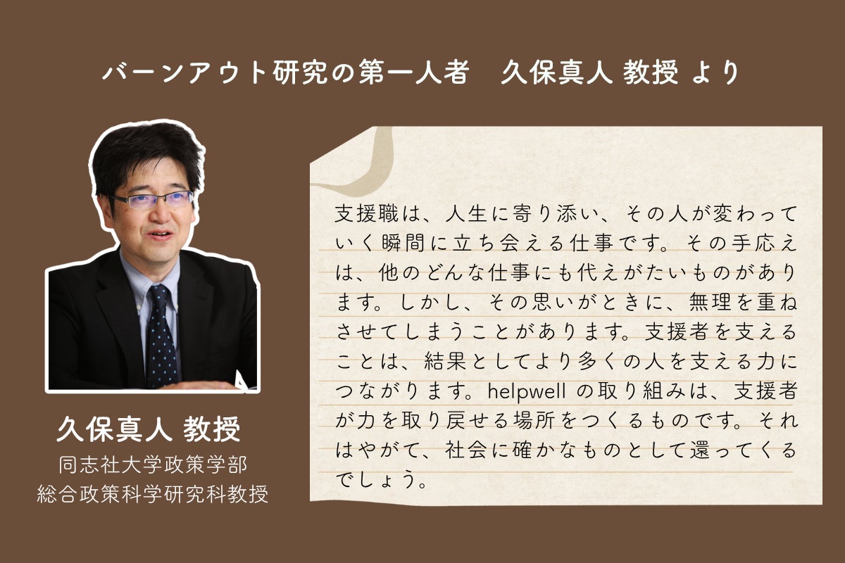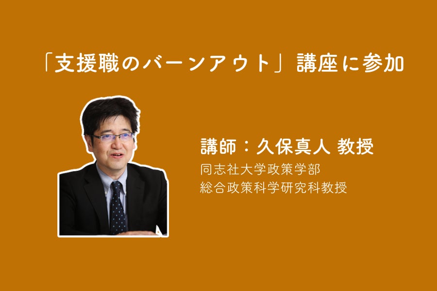 バーンアウト研究の第一人者である同志社大学政策学部 総合政策科学研究科 久保真人教授をお招きし、「対人支援職のバーンアウト」講座を開催します。 医療・福祉・介護・教育等の対人支援職をはじめとする「人のケアに関わる人」に向けた、対人支援職のバーンアウト/燃え尽きについて学ぶオンラインイベントです。対人支援職にとってなぜ燃え尽きが起きやすいのか、学ぶことからまずは始めてみませんか?