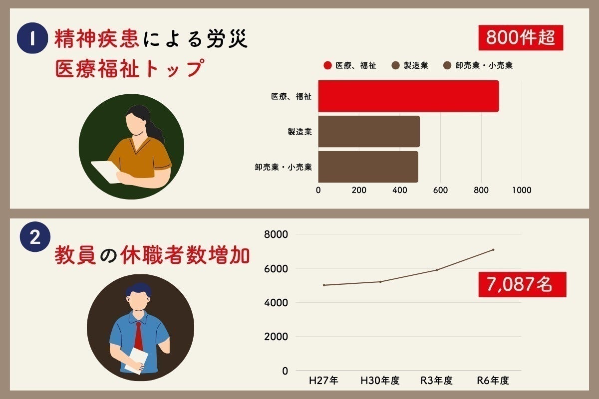 出典:厚生労働省:令和5年度「過労死等の労災補償状況」/文部科学省:令和6年度公立学校教職員の人事行政状況調査について