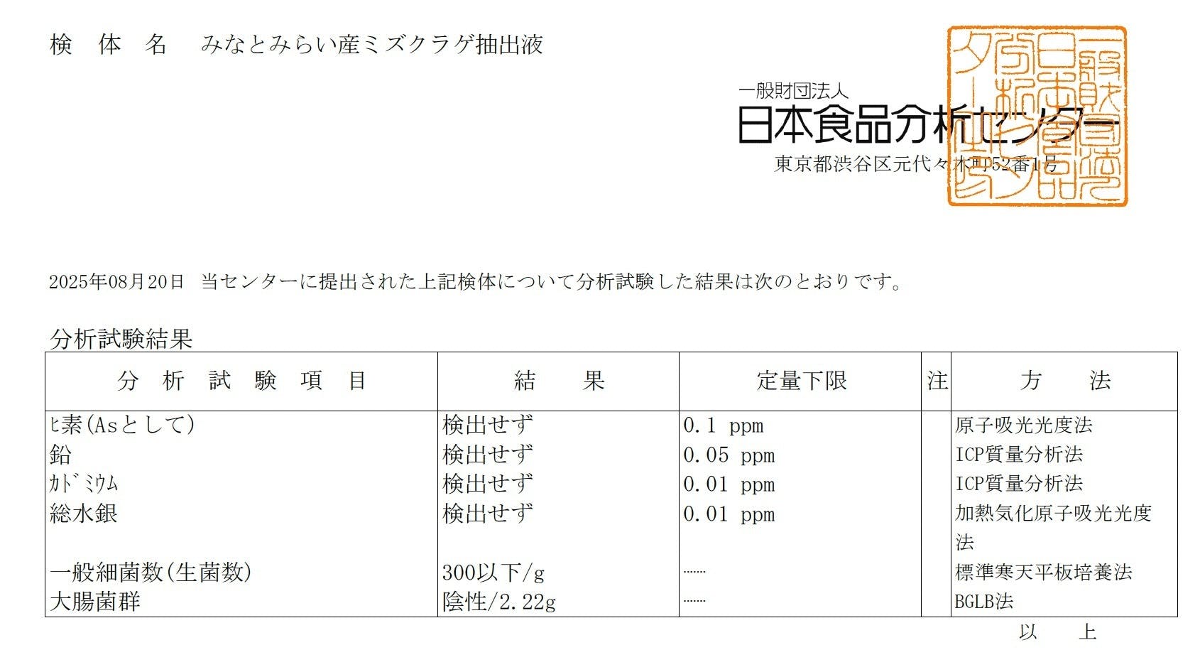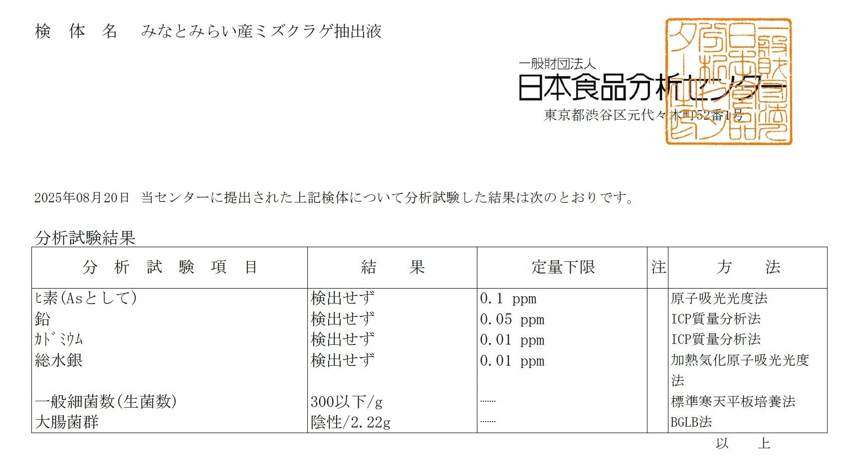 また、くらげの食用利用のための安全分析も完了しており、人が飲んでも問題ないことを確認しました。※実際に飲用し、「美味しい」ことも確認しています。