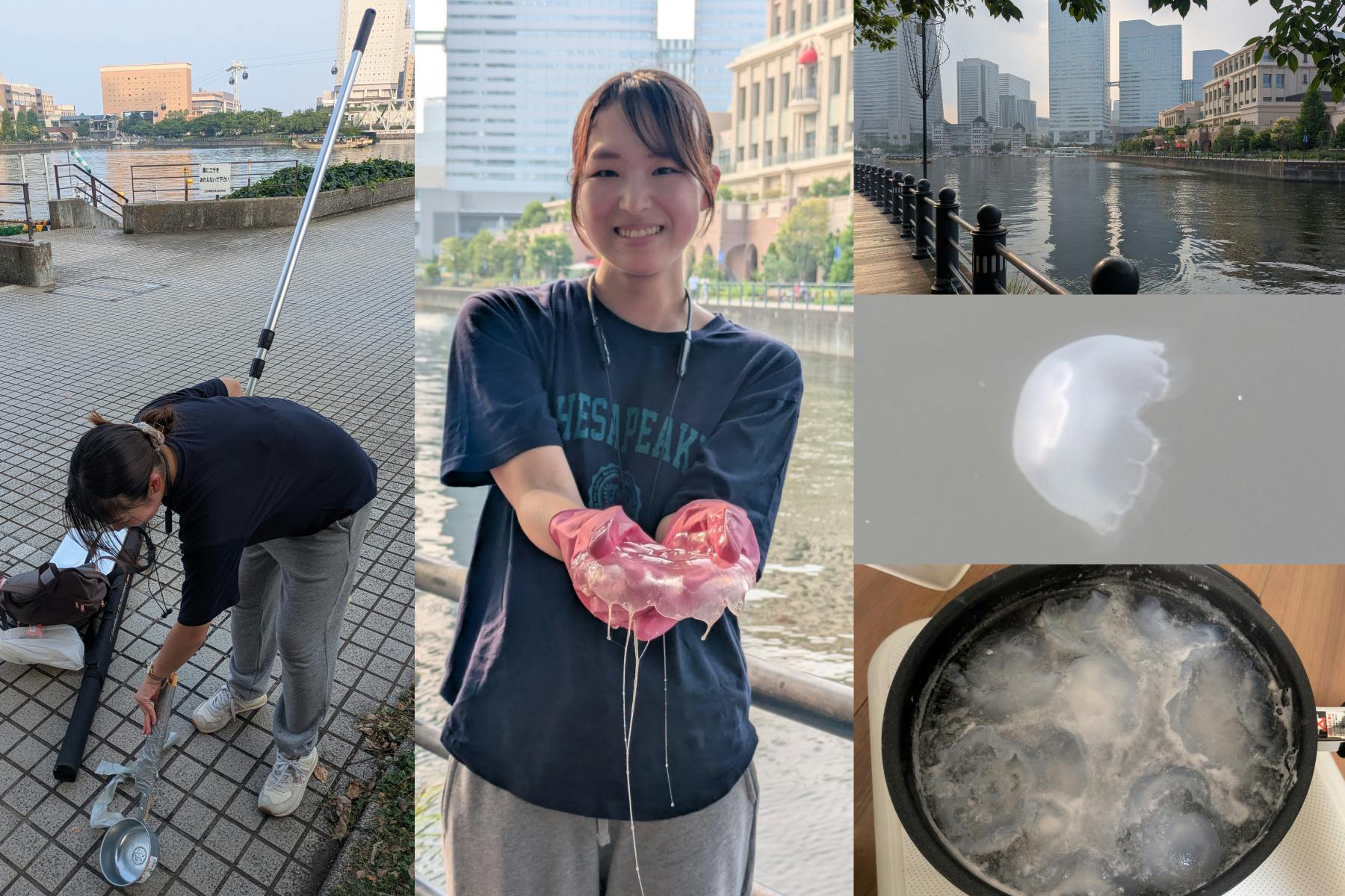 今回は、日本沿岸で最もポピュラーに見られるミズクラゲ(Aurelia sp.)を活用します。2025年に、横浜みなとみらいで大量発生したミズクラゲを横浜市許可のもとで採集し、洗浄、煮沸消毒し、原料化しました。