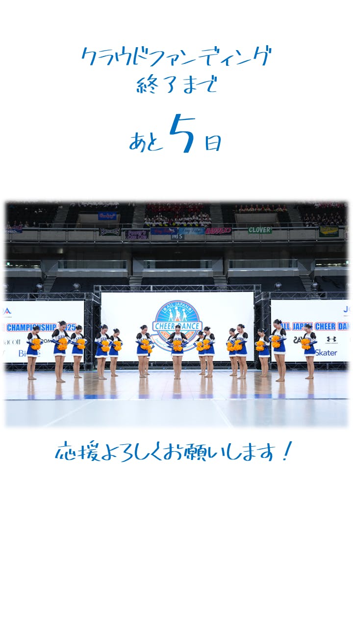 プロジェクト終了まであと5日となりました!今週土曜日、2月28日で終了となります。現在ご支援を検討中の方は、お急ぎください!Liliesは、2026 ICU 世界ジュニアチアリーディング選手権大会 日本代表として、世界大会の舞台に挑戦します。投稿のシェアやいいねでの応援も、世界の舞台に挑む私たちの大きな力になります。世界の舞台へ、一歩ずつ。応援よろしくお願いします