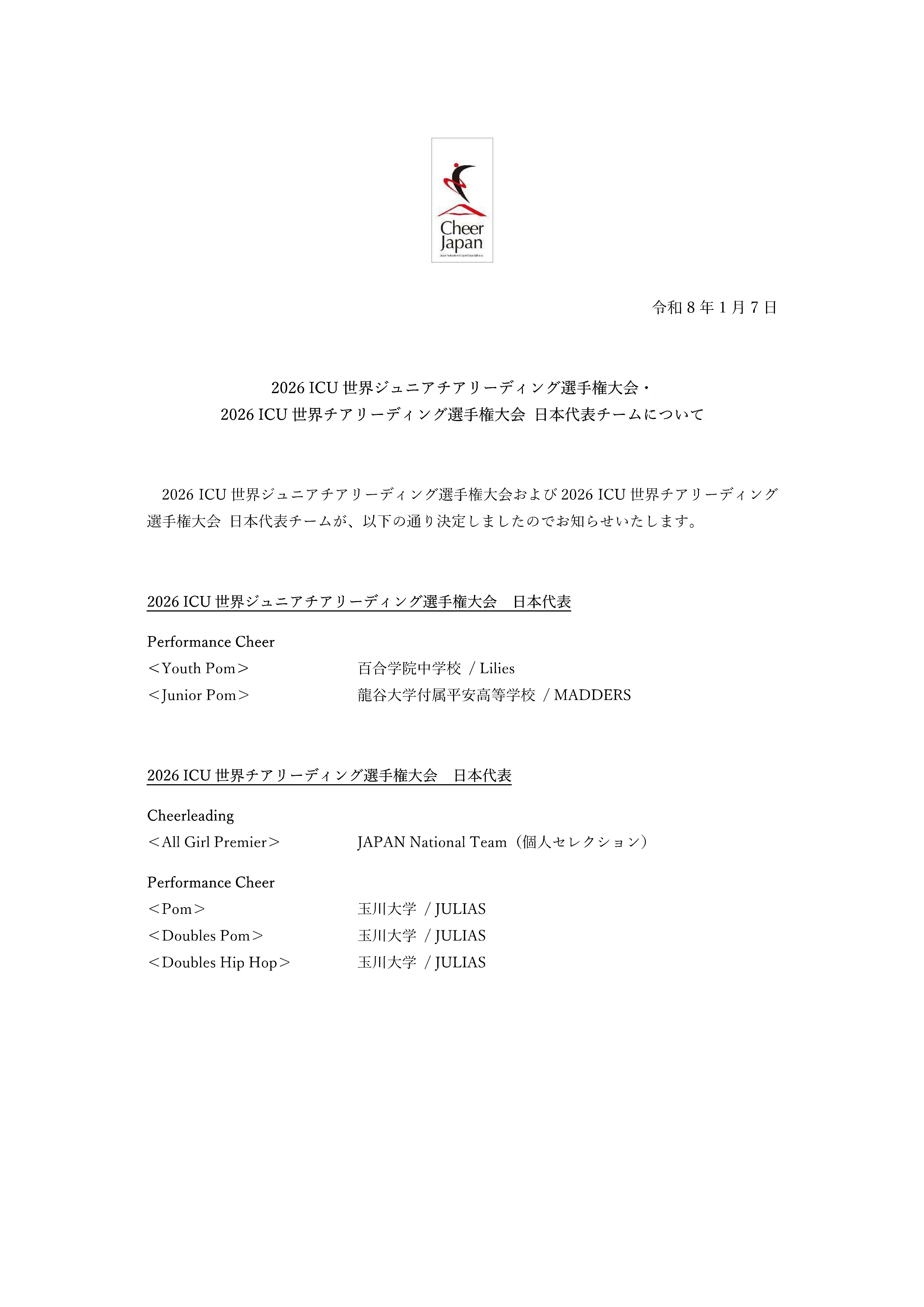 百合学院中学校チアダンス部Liliesは、国内選考を経て日本代表として選出され、2026年4月にアメリカ・オーランドで開催される「2026 ICU 世界ジュニアチアリーディング選手権大会」へ出場することが決定しました。