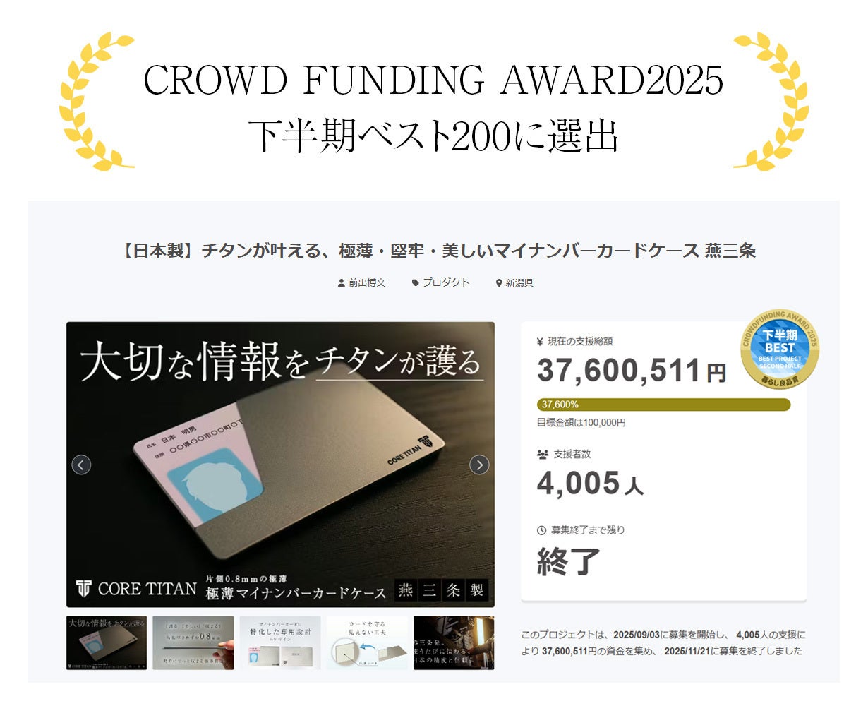 2026/02/15 16:50このたびは「チタン製マイナンバーカードケース」プロジェクトに多大なるご支援をいただき、心より御礼申し上げます。詳細ページはこちらチタン製マイナンバーカードケース今回のカードケースが生まれた新潟県・燕三条は、江戸時代に始まった和釘づくりから金属加工の歴史を紡ぎ、明治以降は洋食器、戦後は刃物や工具など、常に“時代に必要とされるものづくり”を生み出してきました。そして今――その伝統と革新の技術は、世界中から注目される「金属加工の聖地」として受け継がれています。今回のカードケースも、一枚のチタン板を職人が丁寧に削り出し、細部に至るまで妥協なく仕上げた逸品。チタンならではの軽さと強度、美しい質感は、数百年にわたり受け継がれた技と情熱があってこそ生まれました。この挑戦をより多くの方に知っていただきたい――その想いで日々活動しております。皆さまのSNSでのシェアや、ご友人・ご家族へのご紹介が、職人の技を未来へとつなぐ大きな力になります。ぜひ最後までご一緒に、この挑戦を盛り上げていただけますと幸いです。詳細ページはこちらチタン製マイナンバーカードケースコアチタン一同 もっと見る