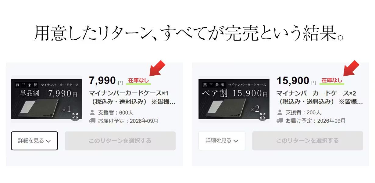 リターンに設定した数量は、工場と何度も交渉し、「これ以上は難しい」という生産キャパシティいっぱいまで確保した数量でした。これだけの数を用意できれば、大丈夫だろうと考えていたにも関わらず、すべて完売という結果。