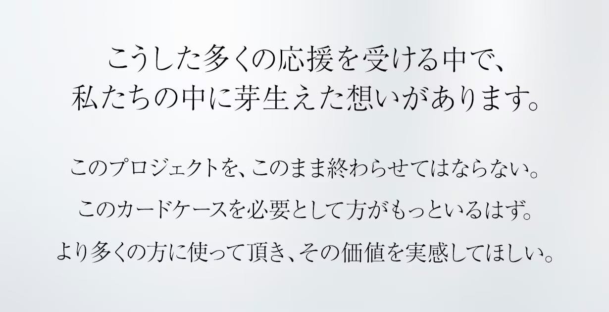 このカードケースが、使ってくださる方の暮らしに安心感と美しさをもたらすことができたなら、これ以上の喜びはありません。共感してくださった方と一緒に、このプロジェクトを育てていけたら嬉しく思います。