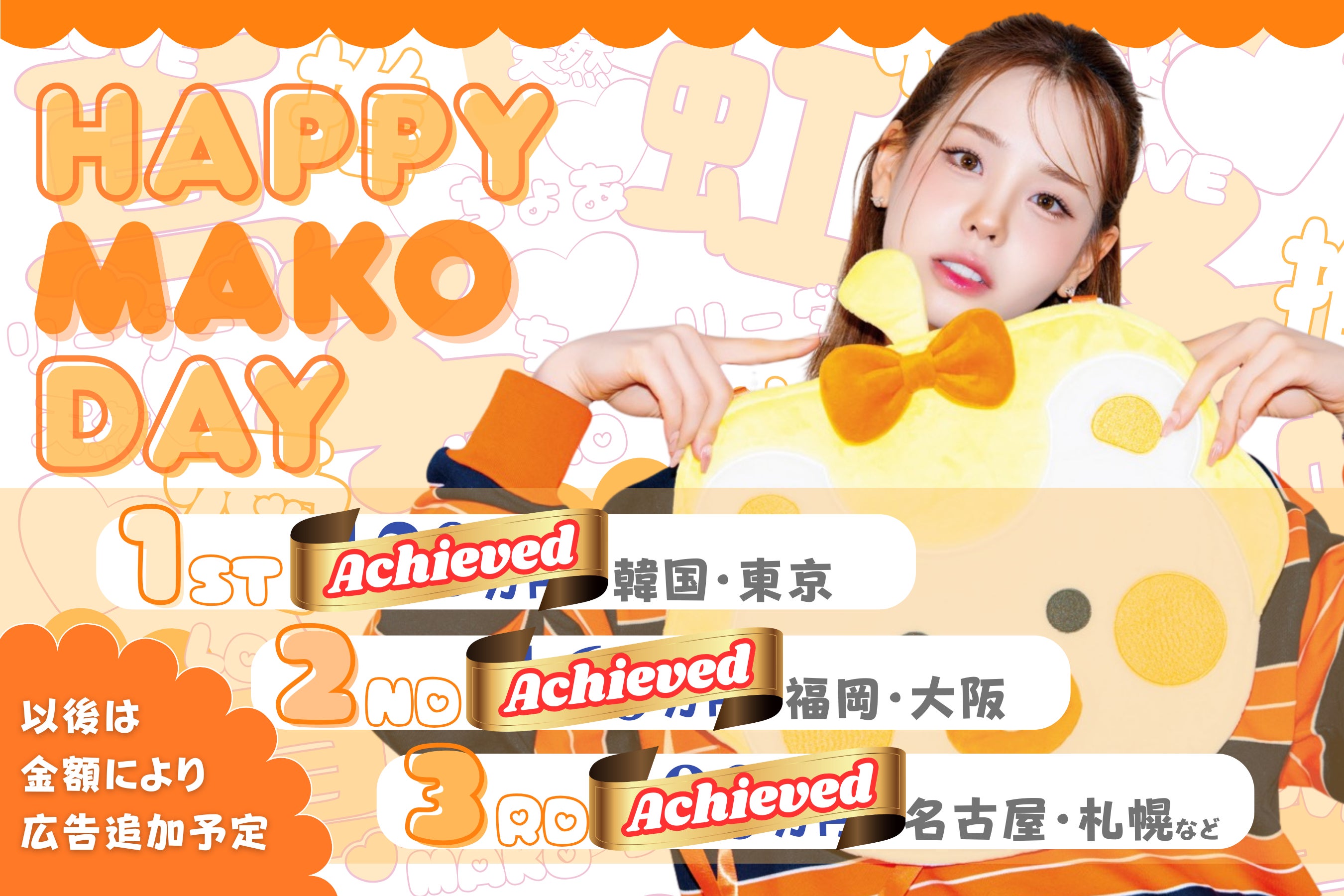 2026/03/22 19:51改めましてたくさんのご支援ありがとうございました!今年も全ての目標を達成し、最終目標を上回るご支援がありましたので、当初予定に加え、宮城・石川・広島・香川の4か所での広告掲載が追加決定となりました。これでMAKOセンイル広告の掲載としては韓国・日本10地域、13か所での広告掲載となります。福岡も小倉駅・福岡空港駅に初進出です!各地の広告掲載期間については、添付の画像をご覧くださいませ。※広告をご覧になる際のご注意※駅係員や周辺施設等へ、広告掲載場所のお問合せ等はご遠慮ください。また、広告周辺が混雑している場合は、その場から離れる等、周りの方のご迷惑にならない様、ご配慮をよろしくお願いします。 もっと見る
