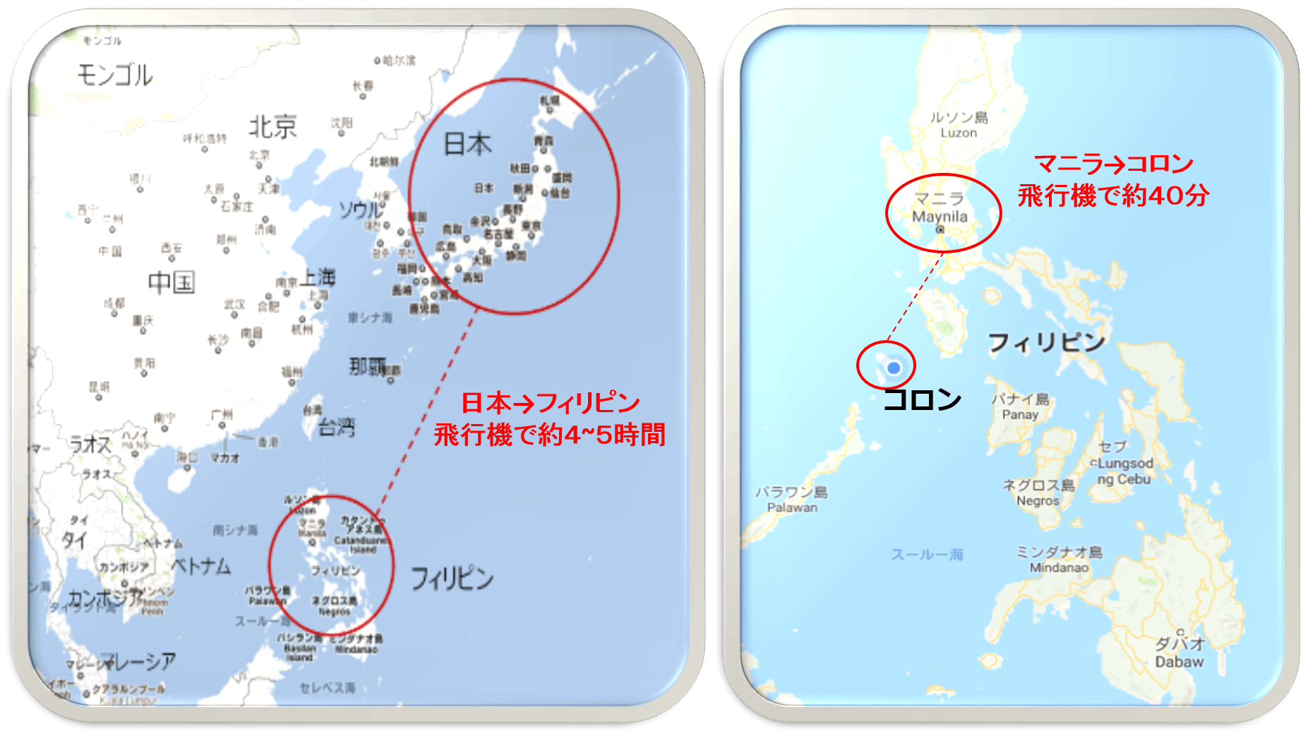 日本からコロン(ブスアンガ島)へ行くためには、マニラまたはセブを経由する必要があります。