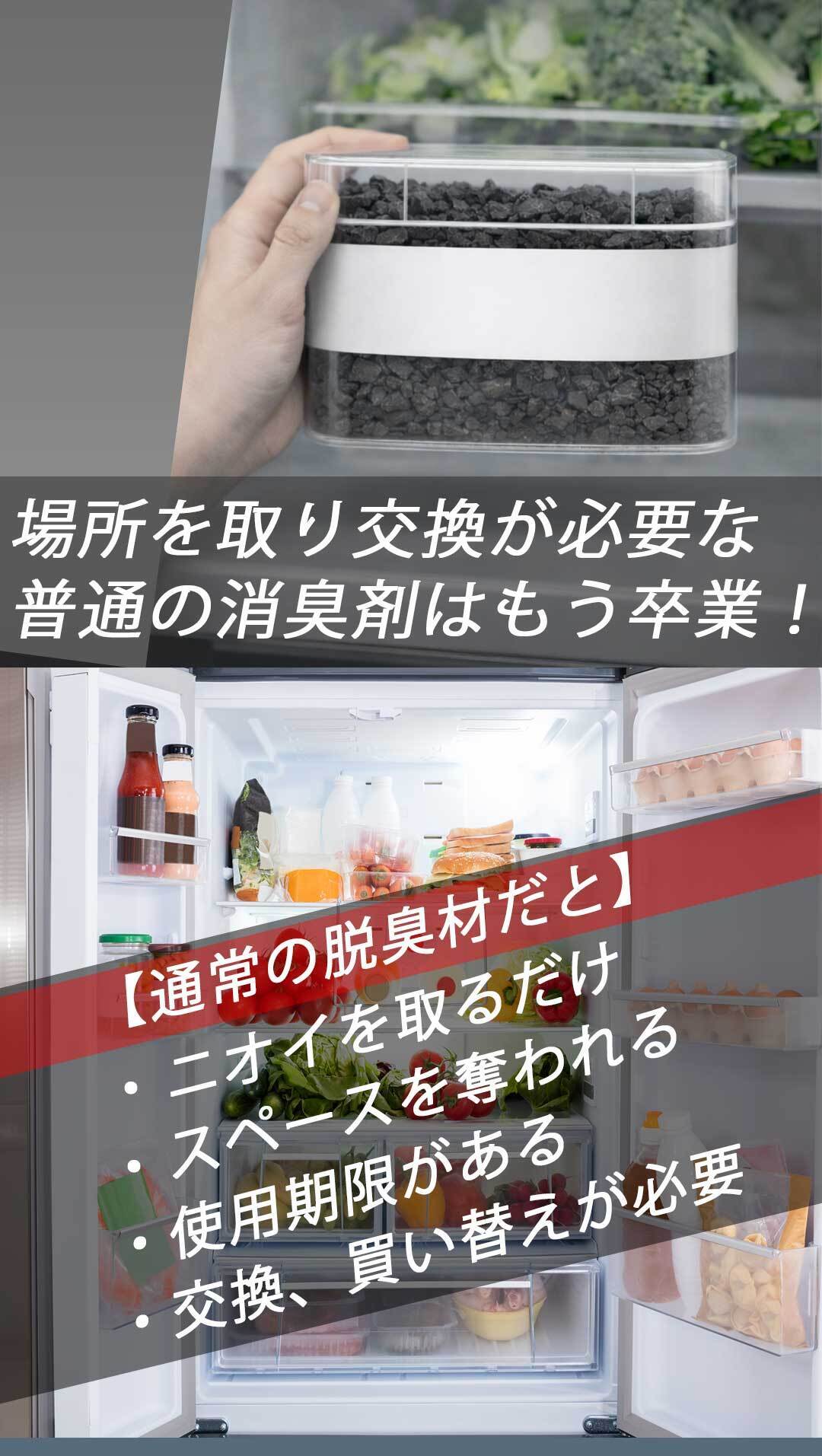 従来の脱臭剤(炭・ゲル)は使用期限があり数ヶ月ごとに買い替えが必要でした。しかもうっかり交換を忘れて冷蔵庫の奥にただの置き物状態になっていることも、、、。