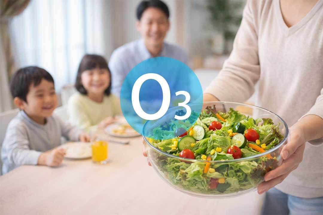 脱臭、除菌により食品の鮮度を長く保つ【EraClean】から放出されるオゾンは、化学記号で「O3」と表され酸素原子(O)が3個が集まってできた物質です。