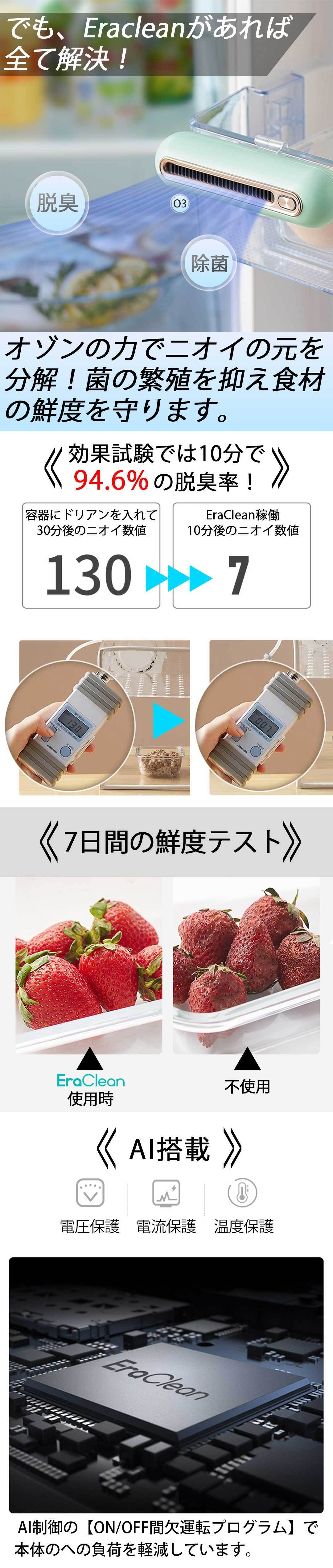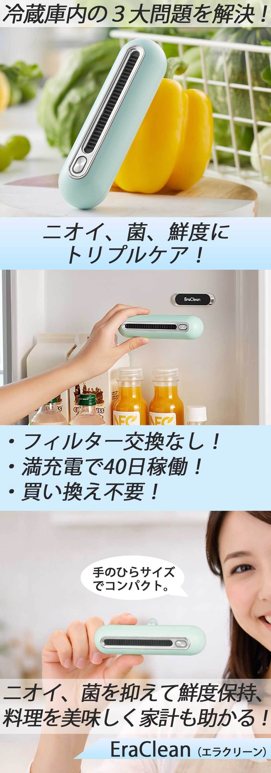 しかしこの【EraClean】なら、排出される「低濃度オゾン」がゆっくりと冷蔵庫内の隅々まで行き渡り、直接ニオイに届きます!しかも脱臭剤とは違いコンパクトサイズでフィルターなどの交換も必要ありません。