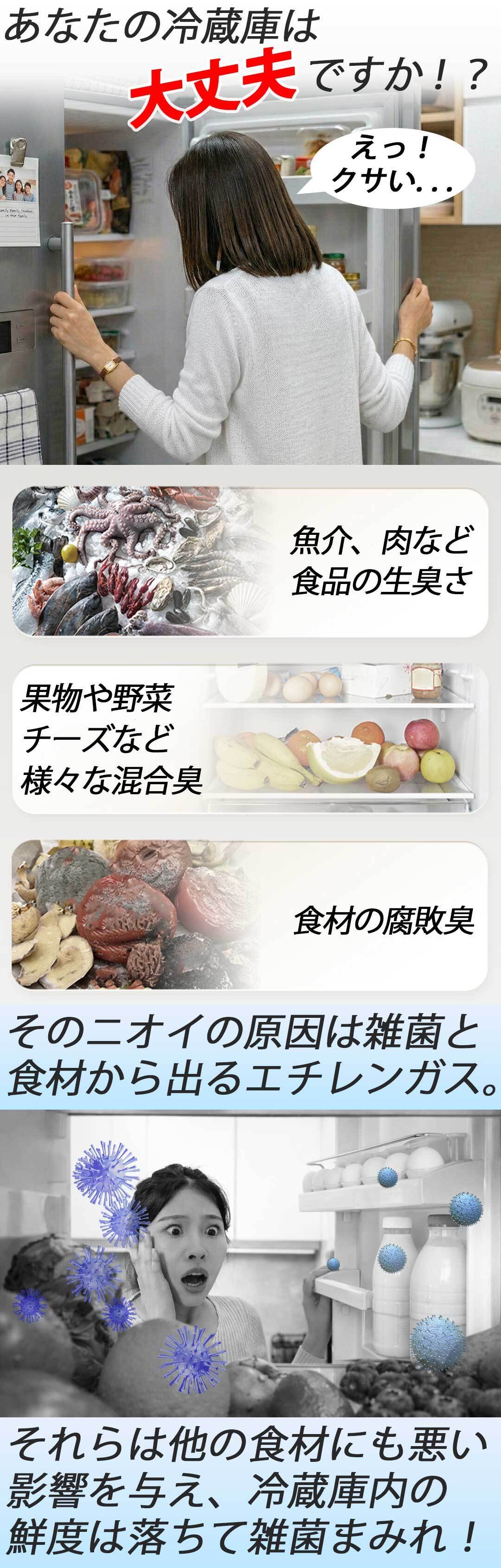 冷蔵庫内のニオイは食品自体から発生するエチレンガスが主な原因となり、他の食材に移ったり鮮度を落としたりと悪影響を及ぼします。