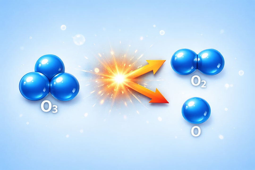よく知られている酸素分子(O2)に比べて不安定で分解しやすい性質を持っているため、 すぐに酸素(O2)と酸素原子(O)に分かれます。