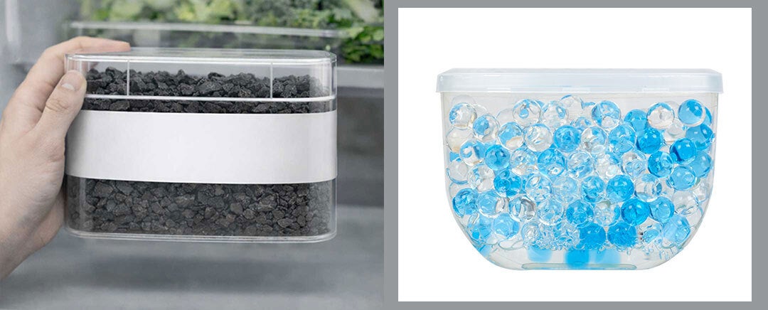 そのため脱臭炭や脱臭ゲルの脱臭剤がよく使われますが、ニオイ自体が脱臭成分に直接触れないと脱臭処理されないので、冷蔵庫のように空気の流れが弱く、棚や食品で仕切られた広い空間では脱臭効果を十分に発揮できません。