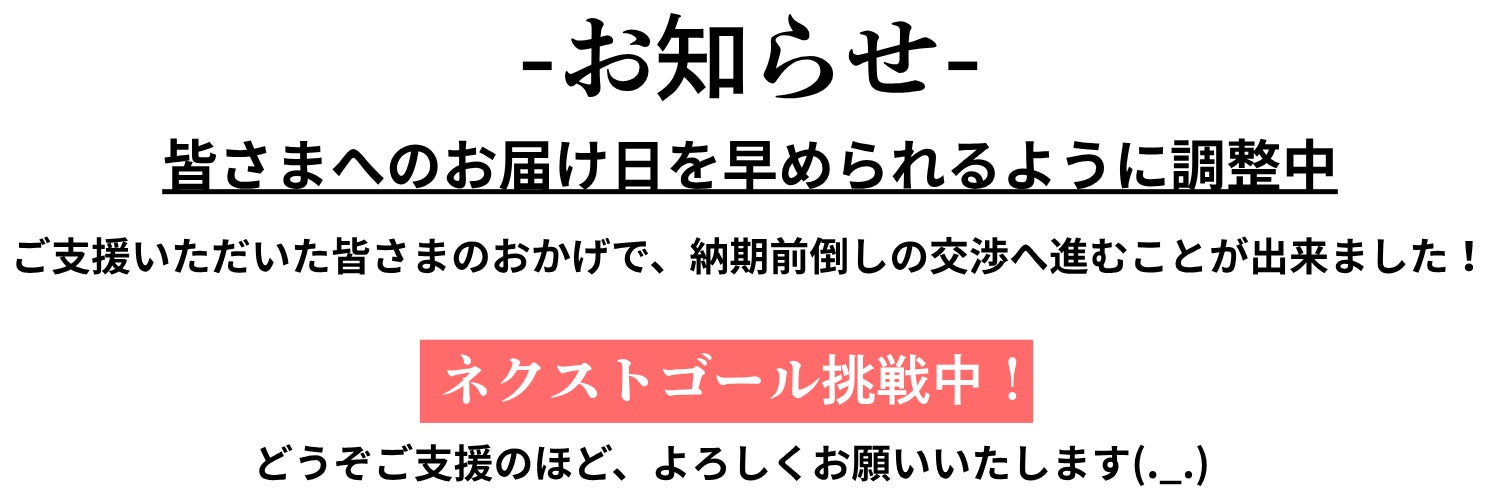 2026/04/10 16:18こんにちは、TransFortuneです。皆さまから多くの温かいご支援をいただき、大変感謝しております。この度、ネクストゴールを60万円に設定し、挑戦させていただくことになりました。\\皆さまへのお届け日を早められるように調整中//早期にご支援いただいた皆さまのおかげで、現在メーカーとの納期前倒しの交渉へ進むことができております。6月中に皆さまのお手元へお届けするスケジュールでしたが、早期にご購入いただいた方から順に、お届け日を早めることが可能になる予定です。正式に決まりましたら、こちらの活動報告にてお知らせいたします。ご好評いただいております2個セットは、ホワイトが残り1セットのみ購入可能となっております。引き続き、ご支援のほどよろしくお願いいたします(._.) もっと見るプロジェクト開始20分で目標金額達成できました!!