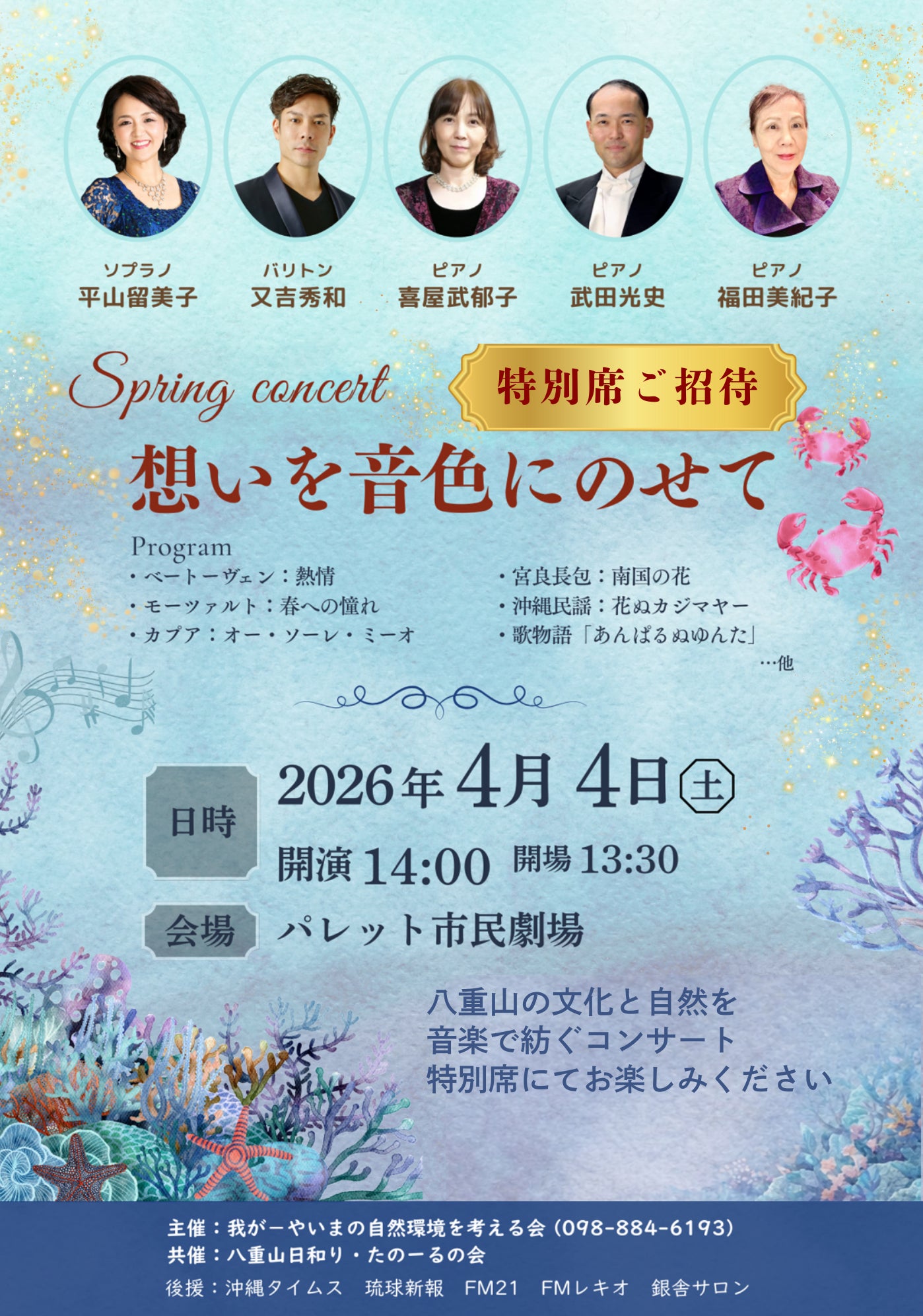 当会主催で2026年4月4日、那覇市で音楽を通じて八重山の文化と自然を楽しんでもらう企画を準備しています。 こちらに支援頂いた方にはこちらのコンサートの特別席をご案内いたします。
