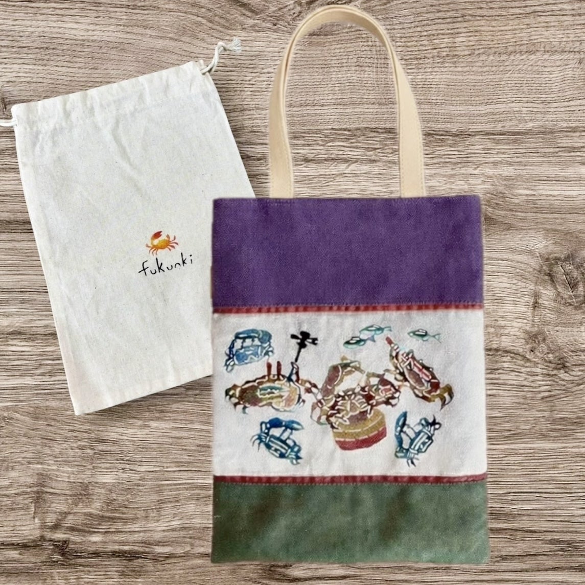 トートバック(34×26cm) カニの紅型模様を施しています。持ち手部分は本革、布部分は綿素材です。職人と相談しながらデザインを決定しました。緑、または紫と緑のバイカラーからお選びください。ひとつひとつ丁寧に制作されます。本クラウドファンディングのために作成しました。当会の活動以外では手に入りません。かわいい紅型模様のカニの袋と、絵本「あんぱるぬゆんた」もご一緒に。