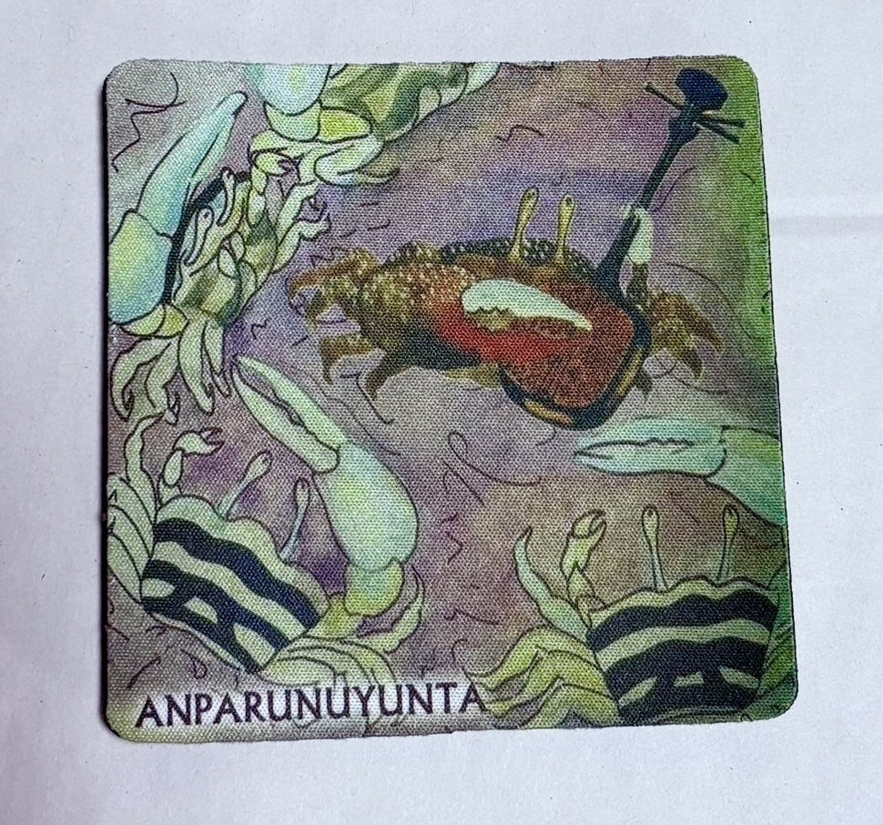 アンパルの代表のカニ、シオマネキのコースター(10cm×10cm)をお届けします。 絵本「あんぱるぬゆんた」から絵本「あんぱるぬゆんた」より、シオマネキが三線を弾き、踊る一場面を印刷しました。 布に印刷して、ラバーに接着されたものです。本クラウドファンディングオリジナルで作成しました。当会の活動以外では販売しておりません。