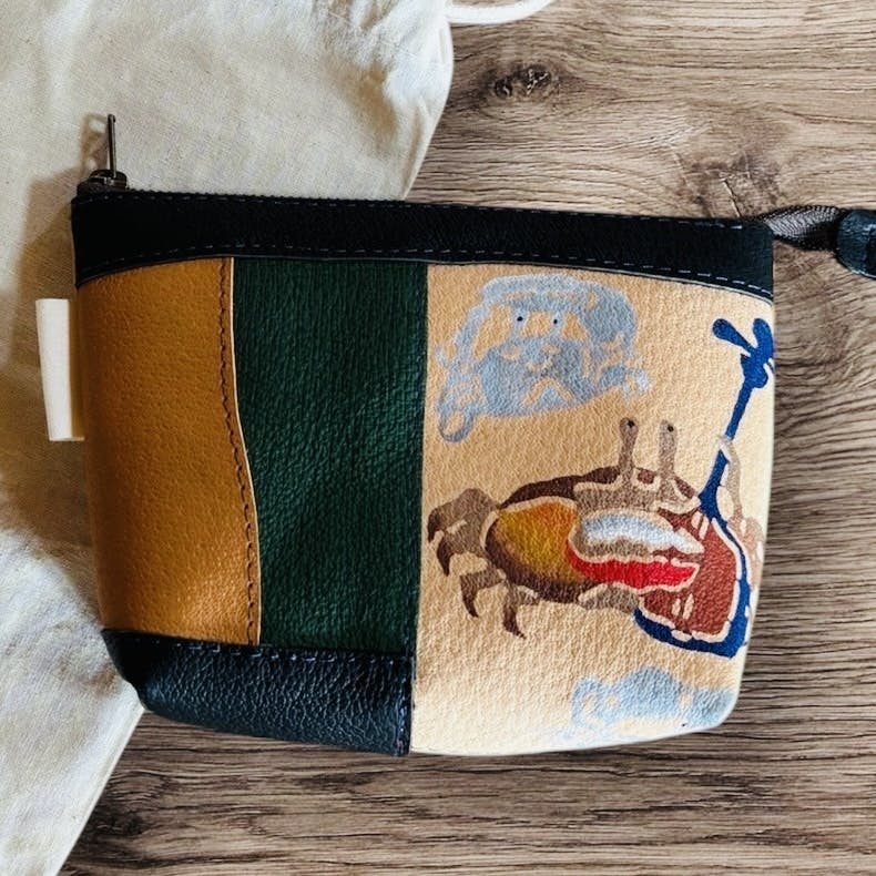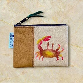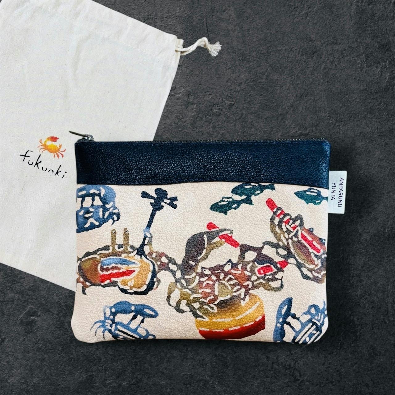 ペタンコポーチ(14cm×18cm) 本革にカニの紅型模様を施しています。職人と相談しながらデザインを決定しました。ひとつひとつ丁寧に制作されます。 本クラウドファンディングオリジナルで作成しました。当会の活動以外では手に入りません。かわいい紅型模様のカニの袋と絵本「あんぱるぬゆんた」もご一緒に。