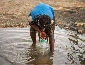 汚れた水たまりから水を汲む