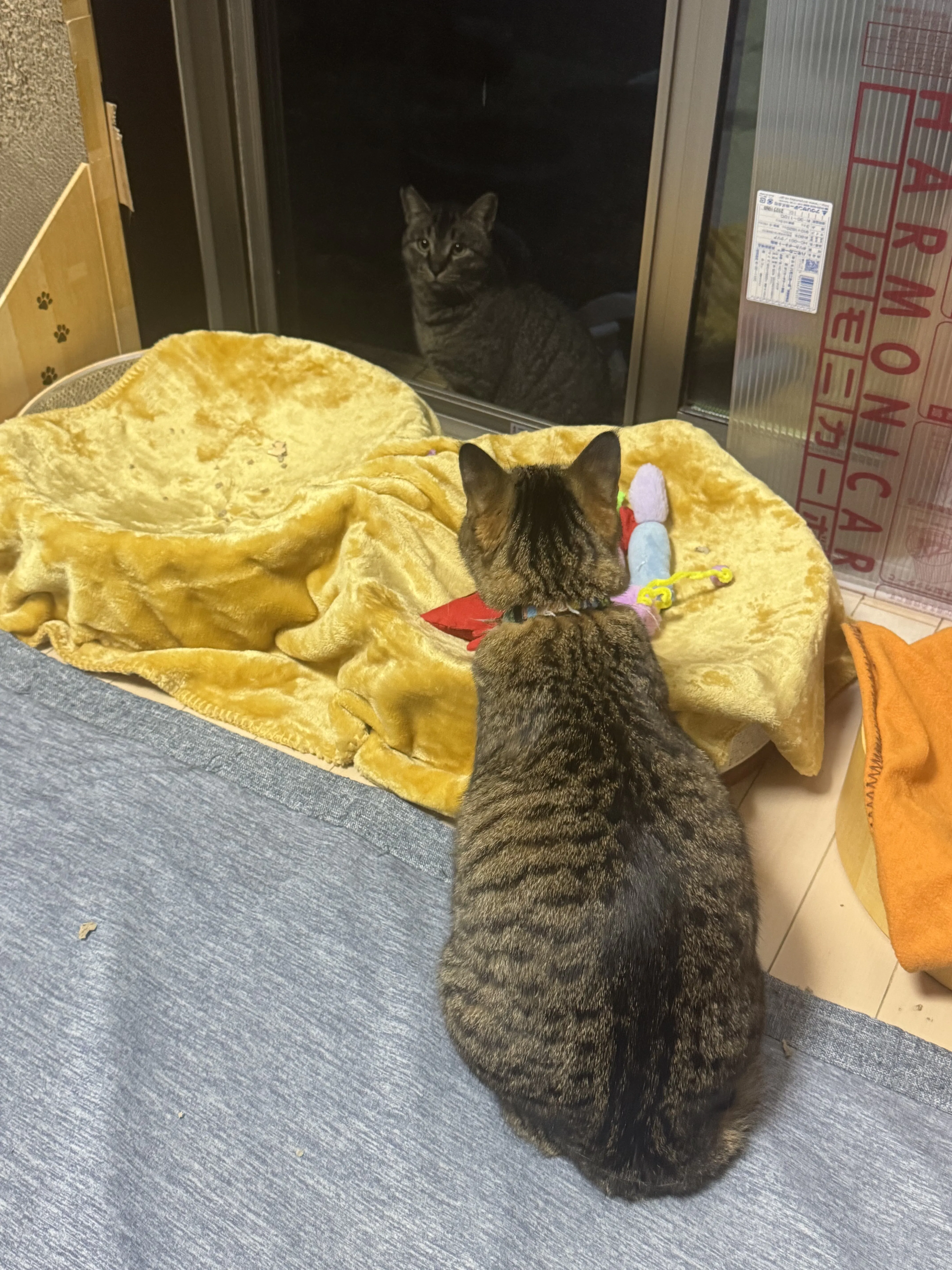 しっかり食べ終わると、今度は道路越しに我が家の猫と“会話”をするのが日課になりました。
