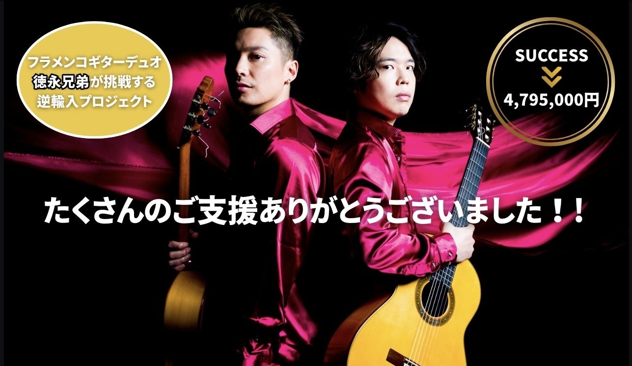 フラメンコギターデュオの徳永兄弟(健太郎、康次郎)です。僕たちは両親(父はギタリスト、母はダンサー)の影響で幼少期よりフラメンコに出会い、中学卒業後15歳でスペインのフラメンコ専門学校へ留学、全課程を終了後帰国しフラメンコギターデュオ「徳永兄弟」としてこれまで国内外でのライブやイベントを行い、多くの方々にフラメンコの魅力を伝えてきました。そして今回のプロジェクトでは今までの活動を通じて得た経験を元に、僕たちにしかできない新しいことに挑戦します。