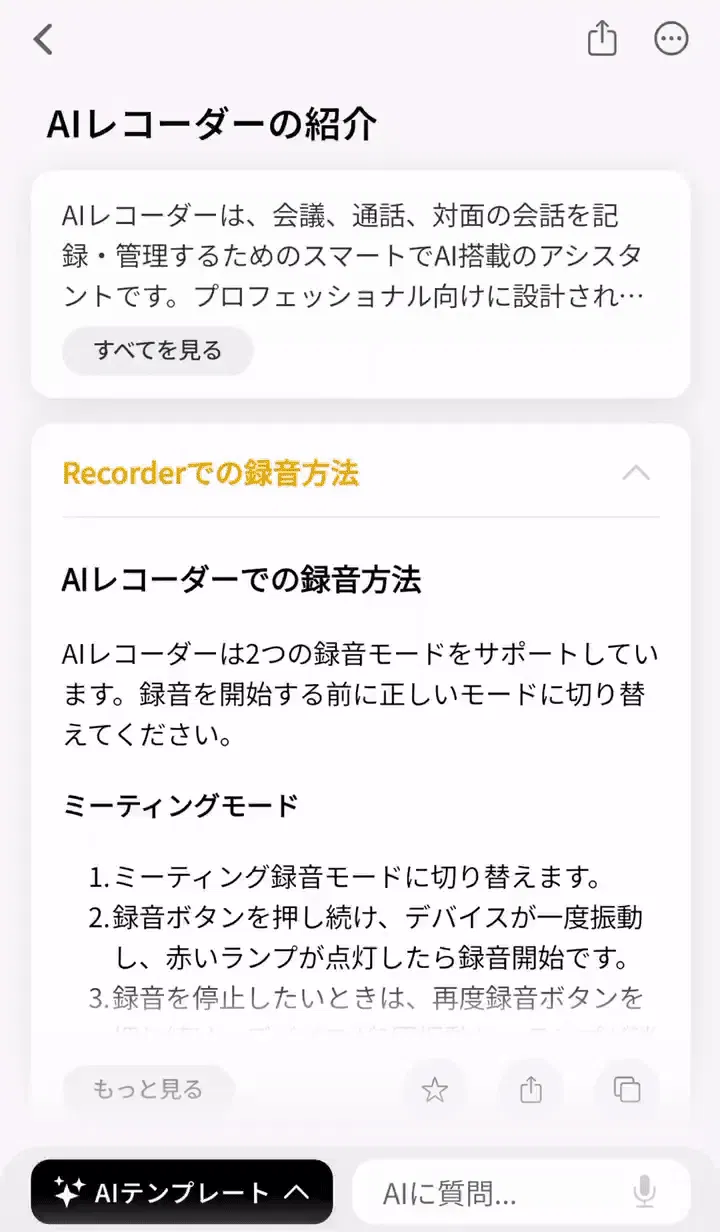 30種類以上のカスタマイズ、AIが生成した要約に満足できない場合でも、その場で表現や内容を自由に変更できます。さらに、自分の業務フローに最適化した独自の「カスタムテンプレート」を作成することも可能。自分専用のAIアシスタントへと進化させることができます。