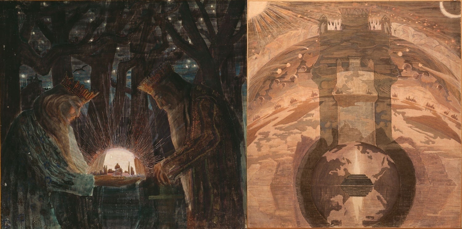 (写真左)ミカロユス・コンスタンティナス・チュルリョーニス《おとぎ話(王たちのおとぎ話)》1909年、テンペラ/カンヴァス、国立M. K. チュルリョーニス美術館(カウナス)所蔵M. K. Čiurlionis National Museum of Art, Kaunas, Lithuania.