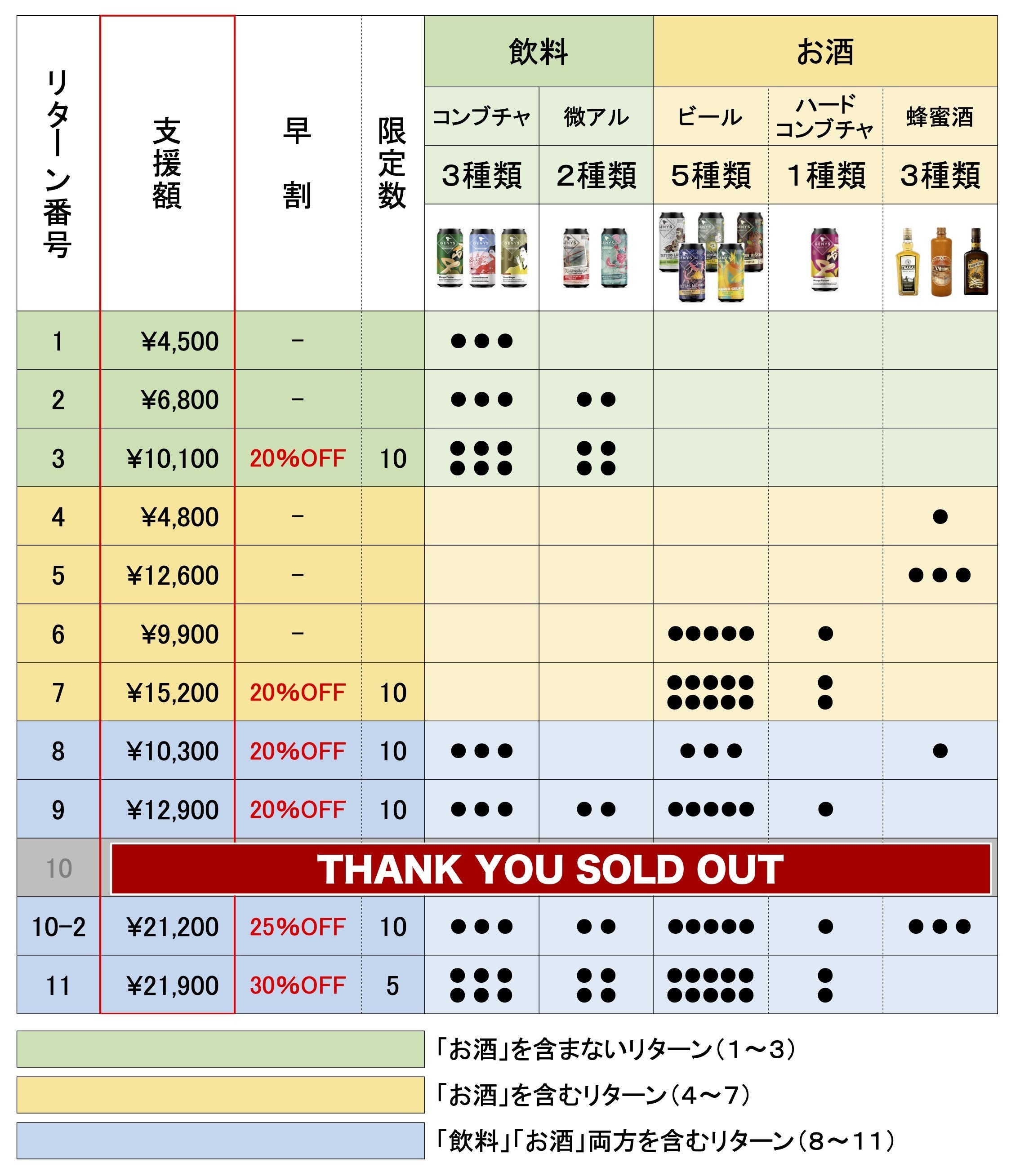 カテゴリ別にご紹介した後に、リターン一覧表も掲載しています。どのリターンにどの商品が含まれるのか確認する際に、ご活用いただけると幸いです。