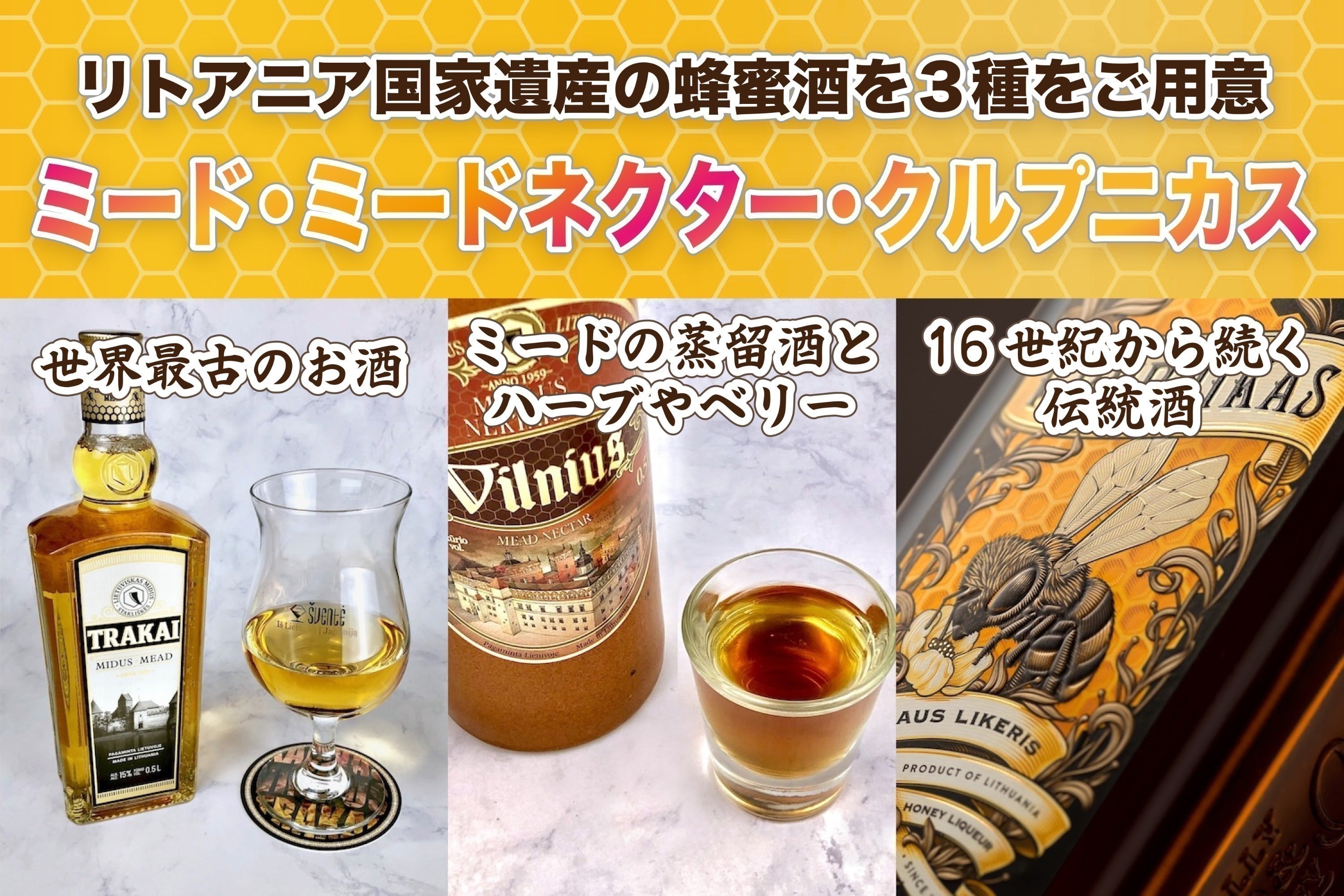 リエトヴィシュカス・ミドゥスが造る「ミード」と「ミードネクター」、そしてスタンブラスが手がける蜂蜜リキュール「クルプニカス」。これらは全てリトアニアの国家遺産に登録された文化そのものです。