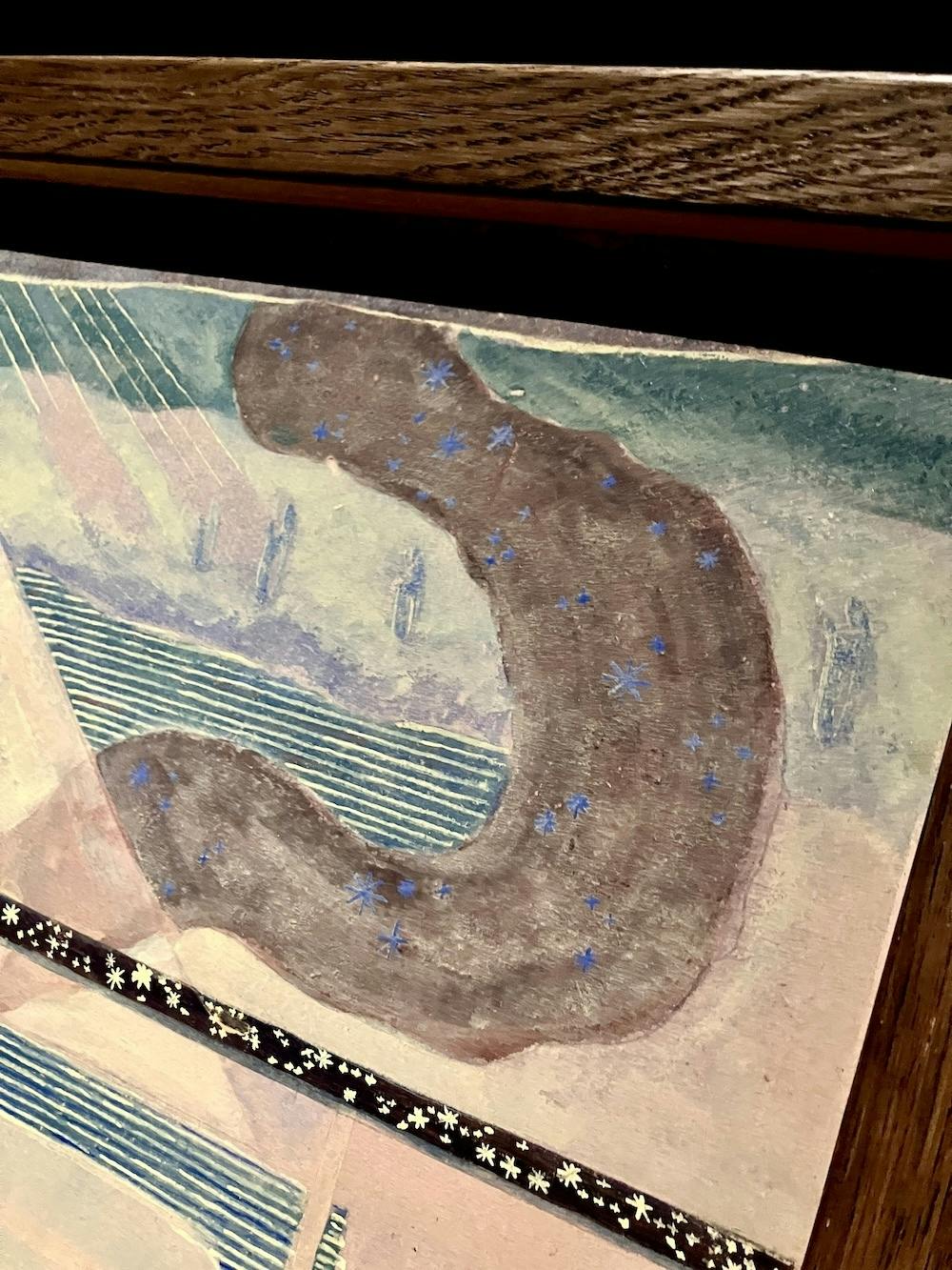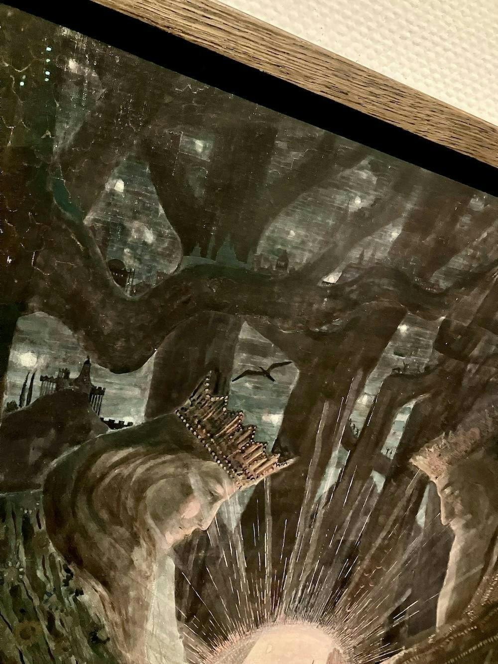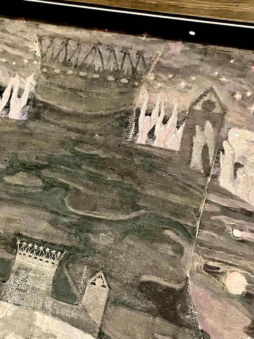 私がチュルリョーニスの作品がとても好きな理由は、象徴的でフィクション性が高く、細部のディテールが細かい点です。寄りの写真をいくつか載せていますが、実は背景でうっすら描かれている建物が別の作品でメインで描かれていたり、あっちの天使とこっちの天使のデザインが一緒、みたいなことが多々あるんです。